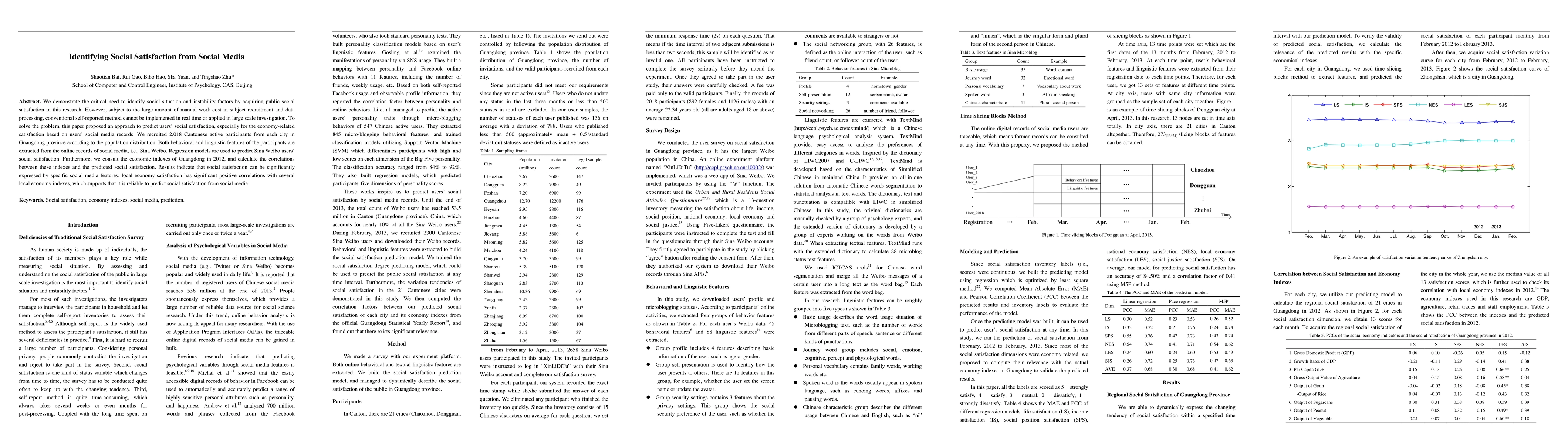 This paper proposes a method to predict users' social satisfaction, particularly economy-related satisfaction, using features extracted from Sina Weibo posts. The study finds significant correlations between predicted social satisfaction and local economic indexes, demonstrating the reliability of predicting social satisfaction from social media data.