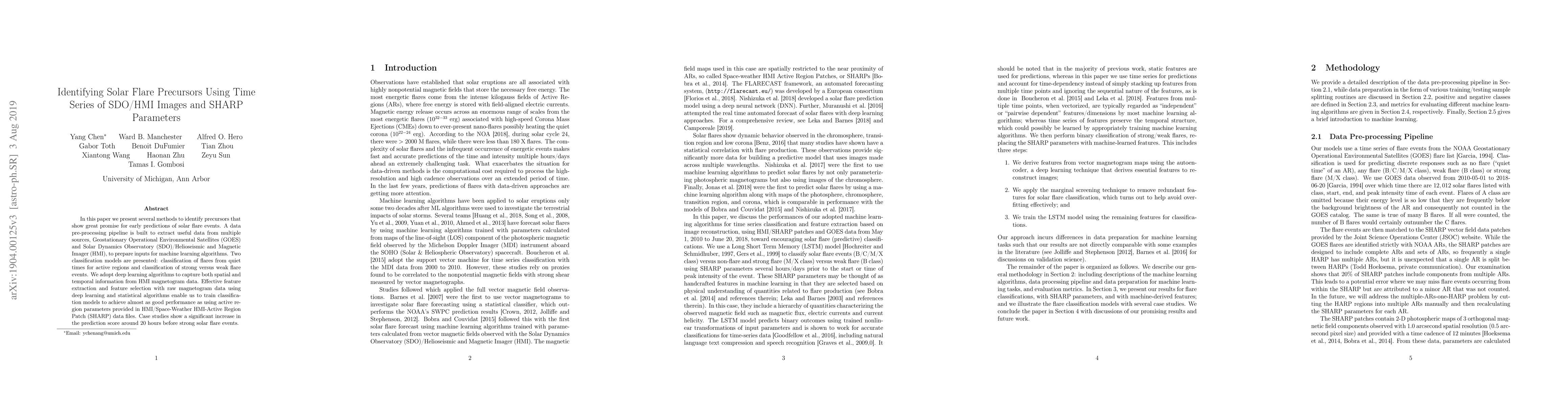 This paper develops methods to predict solar flares using time series data from SDO/HMI and SHARP parameters, employing deep learning for feature extraction and classification. The results show improved prediction scores up to 20 hours before strong solar flare events.