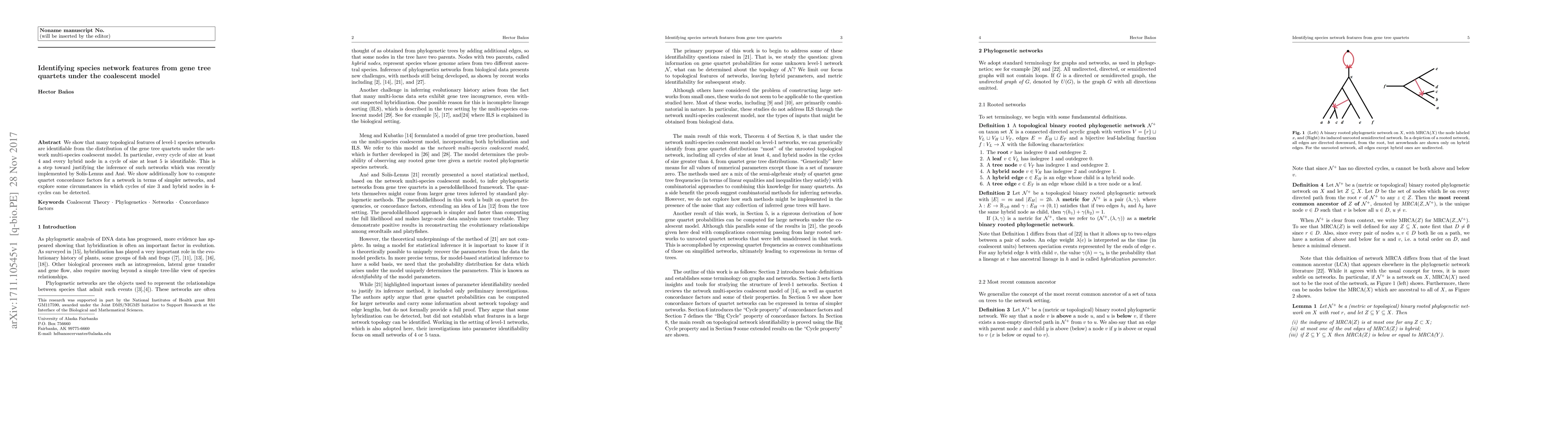This paper demonstrates that several topological features of species networks, including cycles of size at least 4 and hybrid nodes in cycles of size at least 5, can be identified from gene tree quartets under the multi-species coalescent model. It also outlines methods to compute quartet concordance factors and discusses scenarios where smaller cycles and hybrid nodes can be detected.