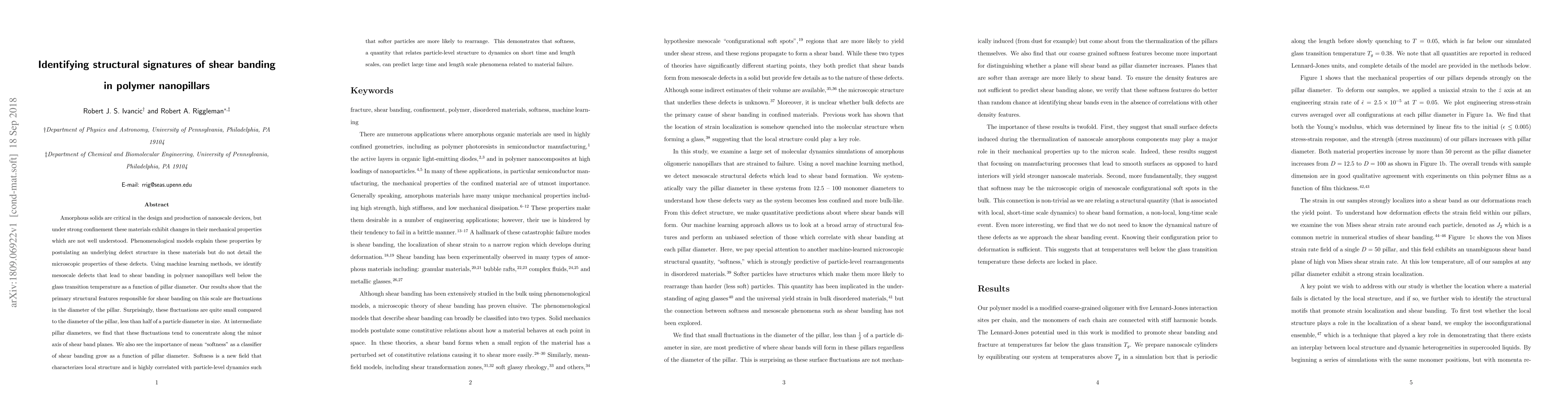 Amorphous solids are critical in the design and production of nanoscale devices, but under strong confinement these materials exhibit changes in their mechanical properties which are not well understood. Phenomenological models explain these properties by postulating an underlying defect structure in these materials but do not detail the microscopic properties of these defects. Using machine learning methods, we identify mesoscale defects that lead to shear banding in polymer nanopillars well below the glass transition temperature as a function of pillar diameter. Our results show that the primary structural features responsible for shear banding on this scale are fluctuations in the diameter of the pillar. Surprisingly, these fluctuations are quite small compared to the diameter of the pillar, less than half of a particle diameter in size. At intermediate pillar diameters, we find that these fluctuations tend to concentrate along the minor axis of shear band planes. We also see the importance of mean softness as a classifier of shear banding grow as a function of pillar diameter. Softness is a new field that characterizes local structure and is highly correlated with particle-level dynamics such that softer particles are more likely to rearrange. This demonstrates that softness, a quantity that relates particle-level structure to dynamics on short time and length scales, can predict large time and length scale phenomena related to material failure.