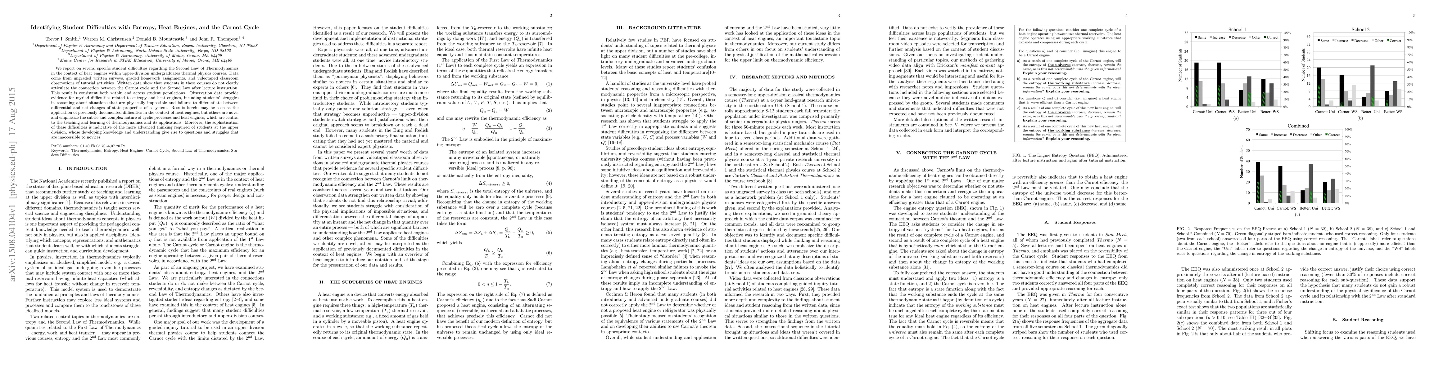 This study identifies specific student difficulties in understanding entropy, heat engines, and the Carnot cycle in upper-division thermal physics courses. Despite lecture instruction, students struggle to connect the Carnot cycle with the Second Law and exhibit issues differentiating between state property changes, highlighting the complex nature of cyclic processes in thermodynamics.