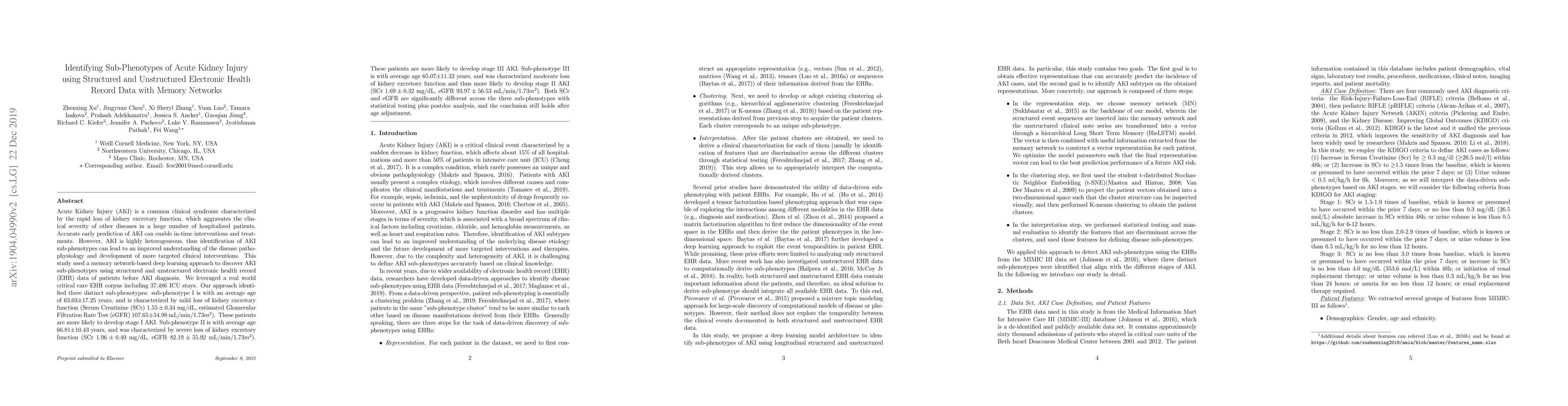 This study employs memory network-based deep learning to identify three distinct sub-phenotypes of Acute Kidney Injury (AKI) using structured and unstructured electronic health record data, revealing differences in kidney excretory function and AKI stage likelihood among sub-phenotypes.