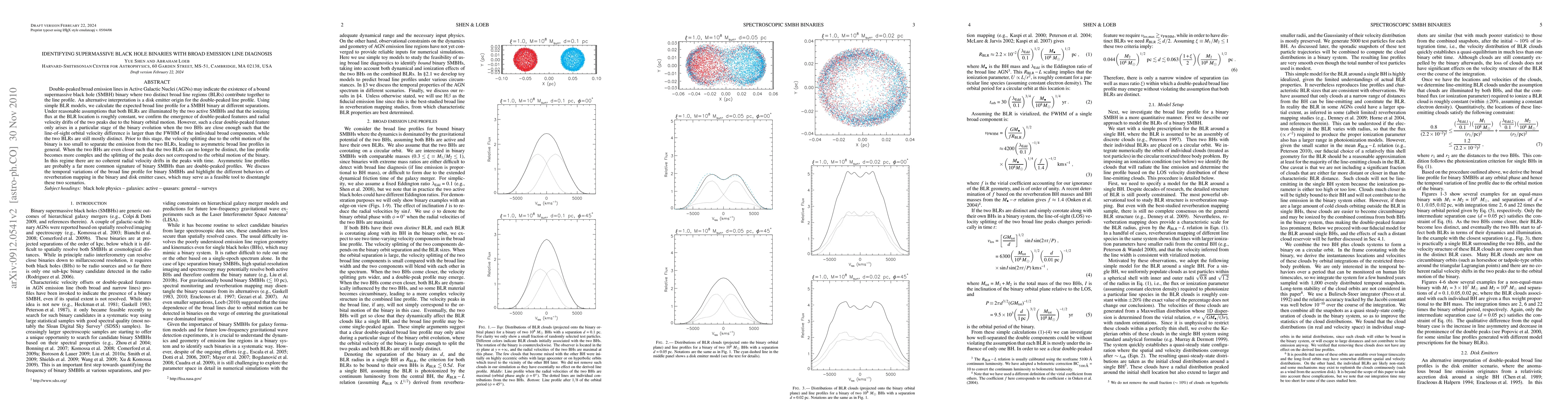 This paper investigates the potential identification of supermassive black hole binaries through double-peaked broad emission lines in Active Galactic Nuclei. It finds that while double-peaked profiles indicate a binary system, such clear features only appear when the black holes are sufficiently close, leading to distinct broad line regions. More commonly, asymmetric profiles suggest binary systems before the black holes merge, complicating the line profile.