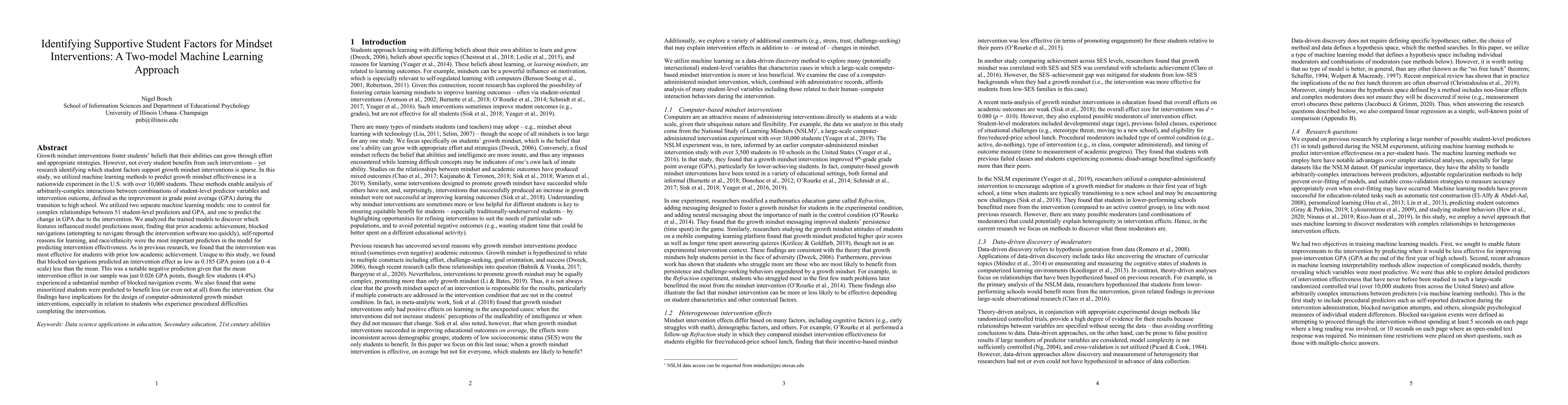This study employs machine learning to identify student factors that enhance the effectiveness of growth mindset interventions, finding that prior academic achievement, blocked navigations during the intervention, self-reported reasons for learning, and race/ethnicity are key predictors. The intervention was most effective for students with low prior academic achievement, while blocked navigations and minoritized racial/ethnic backgrounds were associated with lower intervention benefits.