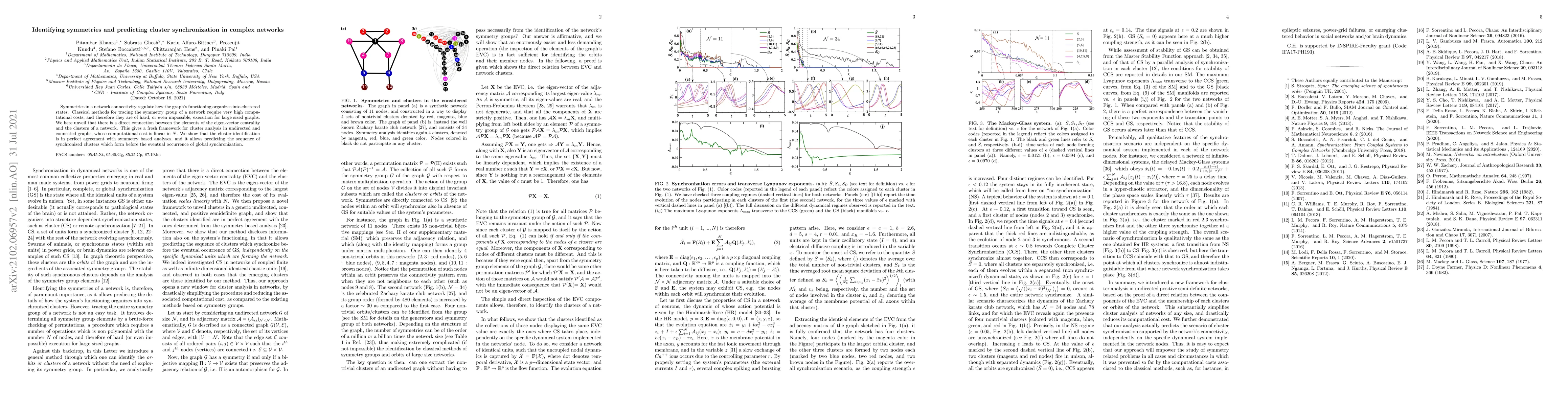 Symmetries in a network connectivity regulate how the graph's functioning organizes into clustered states. Classical methods for tracing the symmetry group of a network require very high computational costs, and therefore they are of hard, or even impossible, execution for large sized graphs. We here unveil that there is a direct connection between the elements of the eigen-vector centrality and the clusters of a network. This gives a fresh framework for cluster analysis in undirected and connected graphs, whose computational cost is linear in $N$. We show that the cluster identification is in perfect agreement with symmetry based analyses, and it allows predicting the sequence of synchronized clusters which form before the eventual occurrence of global synchronization.