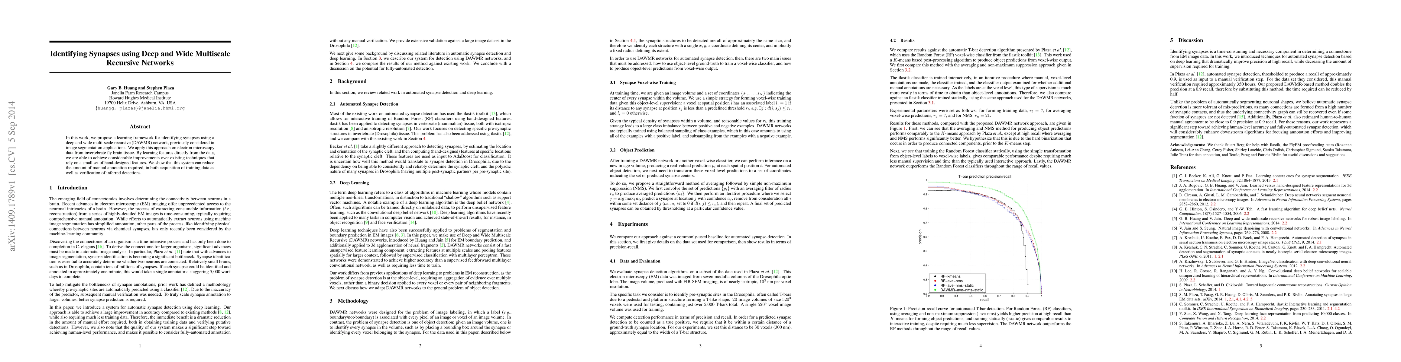 In this work, we propose a learning framework for identifying synapses using a deep and wide multi-scale recursive (DAWMR) network, previously considered in image segmentation applications. We apply this approach on electron microscopy data from invertebrate fly brain tissue. By learning features directly from the data, we are able to achieve considerable improvements over existing techniques that rely on a small set of hand-designed features. We show that this system can reduce the amount of manual annotation required, in both acquisition of training data as well as verification of inferred detections.