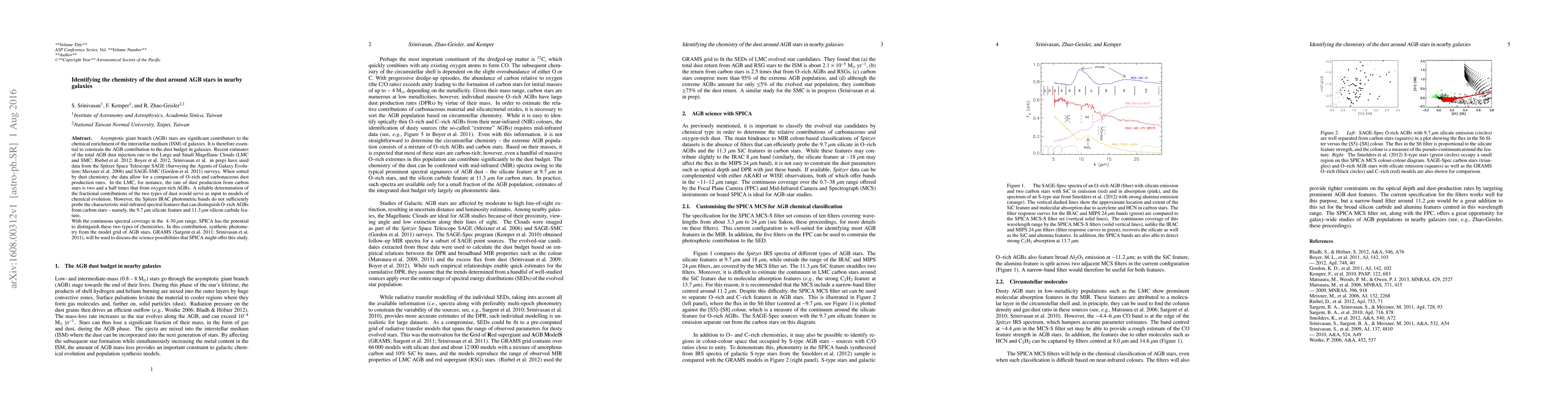 Asymptotic giant branch (AGB) stars are significant contributors to the chemical enrichment of the interstellar medium (ISM) of galaxies. It is therefore essential to constrain the AGB contribution to the dust budget in galaxies. Recent estimates of the total dust injection rate to the Large and Small Magellanic Clouds (LMC and SMC; Riebel et al. 2012, Boyer et al. 2012, Srinivasan et al. in prep) have used data from the Spitzer Space Telescope SAGE (Surveying the Agents of Galaxy Evolution; Meixner et al. 2006) and SAGE-SMC (Gordon et al. 2011) surveys. When sorted by dust chemistry, the data allow for a comparison of O-rich and carbonaceous dust-production rates. In the LMC, for instance, the rate of dust production from carbon stars is about two and a half times that from oxygen-rich AGBs. A reliable determination of the fractional contributions of the two types of dust would serve as input to models of chemical evolution. However, the Spitzer IRAC photometric bands do not sufficiently probe the characteristic mid-infrared spectral features that can distinguish O-rich AGBs from carbon stars - namely, the 9.7 $\mu$m silicate feature and the 11.3 $\mu$m silicon carbide feature. With the continuous spectral coverage in the 4-30 $\mu$m range, SPICA has the potential to distinguish these two types of chemistries. In this contribution, synthetic photometry from the model grid of AGB stars, GRAMS (Sargent et al. 2011; Srinivasan et al. 2011) will be used to discuss the science possibilities that SPICA might offer this study.