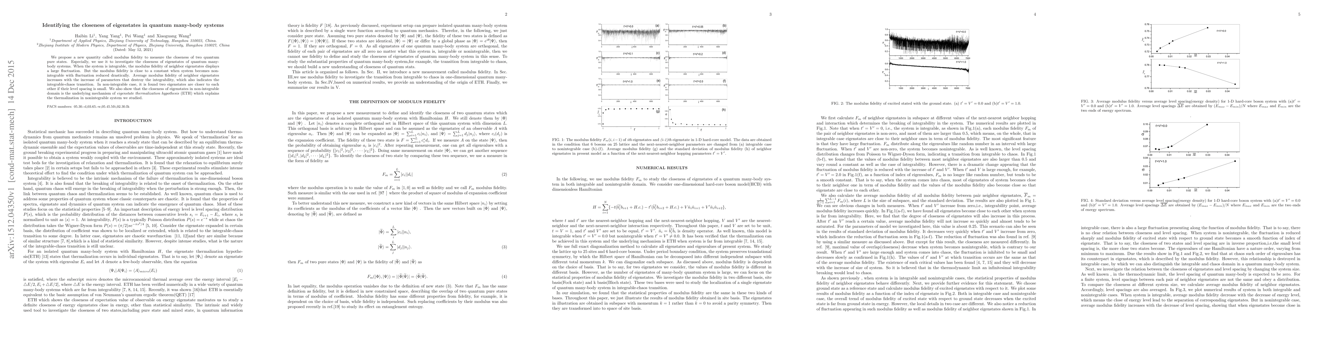 We propose a new quantity called modulus fidelity to measure the closeness of two quantum pure states. Especially, we use it to investigate the closeness of eigenstates of quantum many-body systems. When the system is integrable, the modulus fidelity of neighbor eigenstates displays a large fluctuation. But the modulus fidelity is close to a constant when system becomes non-integrable with fluctuation reduced drastically. Average modulus fidelity of neighbor eigenstates increases with the increase of parameters that destroy the integrability, which also indicates the integrable-chaos transition. In non-integrable case, it is found two eigenstates are closer to each other if their level spacing is small. We also show that the closeness of eigenstates in non-integrable domain is the underlying mechanism of \emph{eigenstate thermalization hypothesis} (ETH) which explains the thermalization in nonintegrable system we studied.
