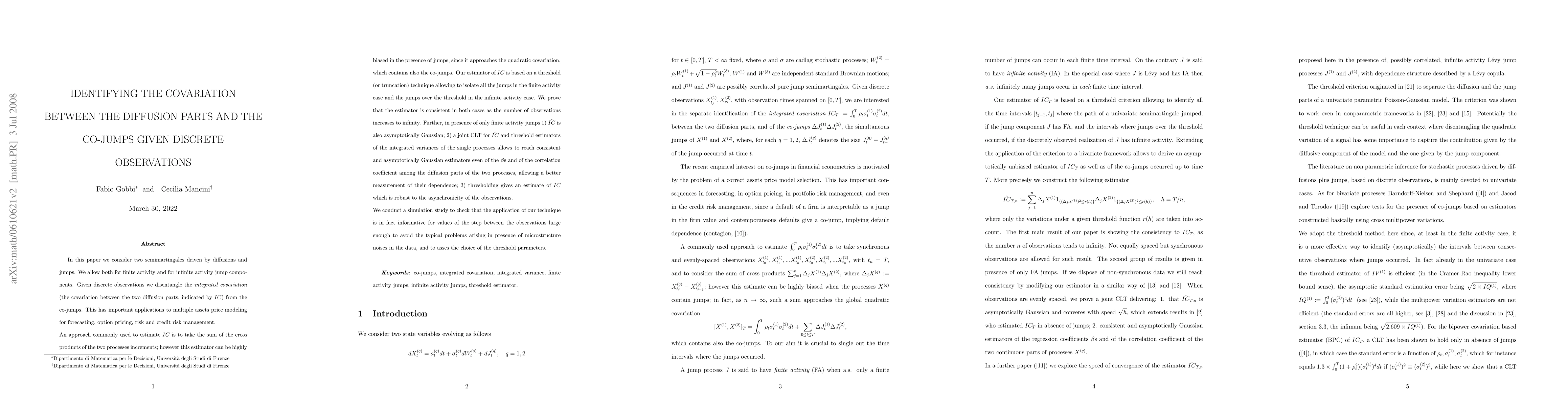 A new method is presented to estimate the covariation between the diffusion parts of two semimartingales driven by diffusions and jumps, allowing for more accurate modeling of multiple assets prices in finance.
