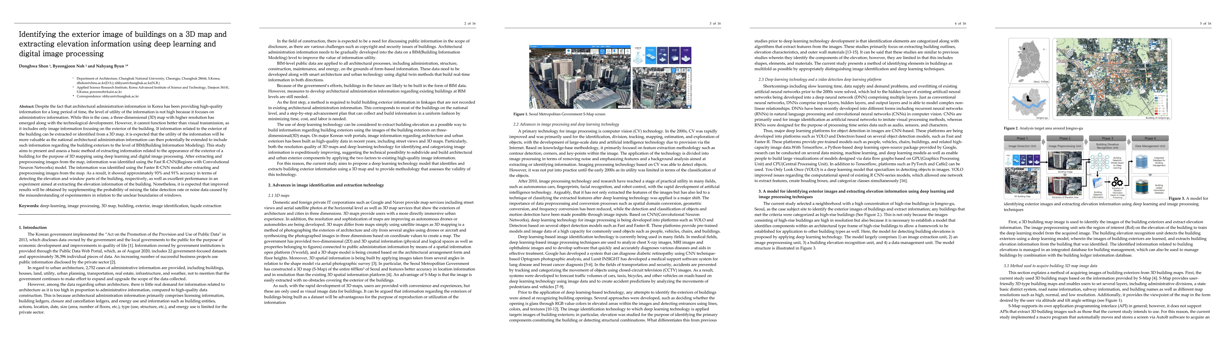 This study proposes a method using deep learning and digital image processing to extract exterior building information from high-resolution 3D maps, achieving 93% accuracy in detecting building elevation and 91% in identifying windows. The method employs the Faster R-CNN model for image identification, aiming to enhance the utility of national architectural administration information.