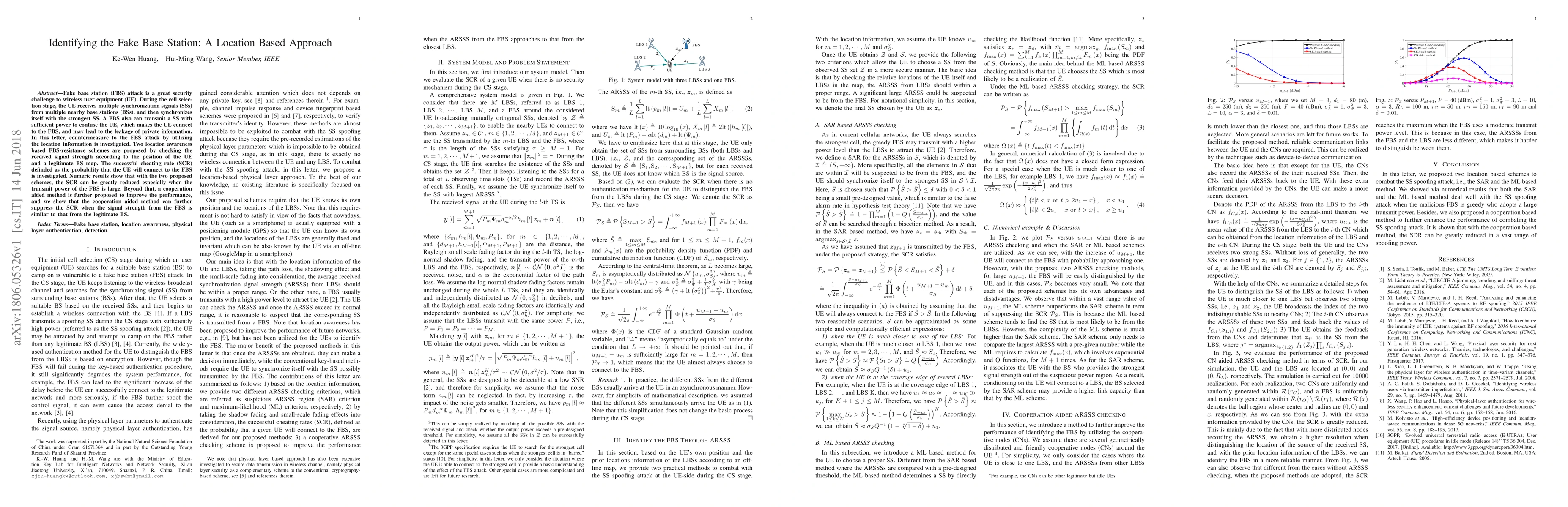 This paper proposes two location-based schemes to counter fake base station (FBS) attacks in wireless networks by leveraging UE and legitimate BS position data to reduce the successful cheating rate (SCR). Additionally, a cooperative method is introduced to further suppress the SCR when FBS signal strength is similar to the legitimate BS, demonstrating significant effectiveness against FBS attacks.