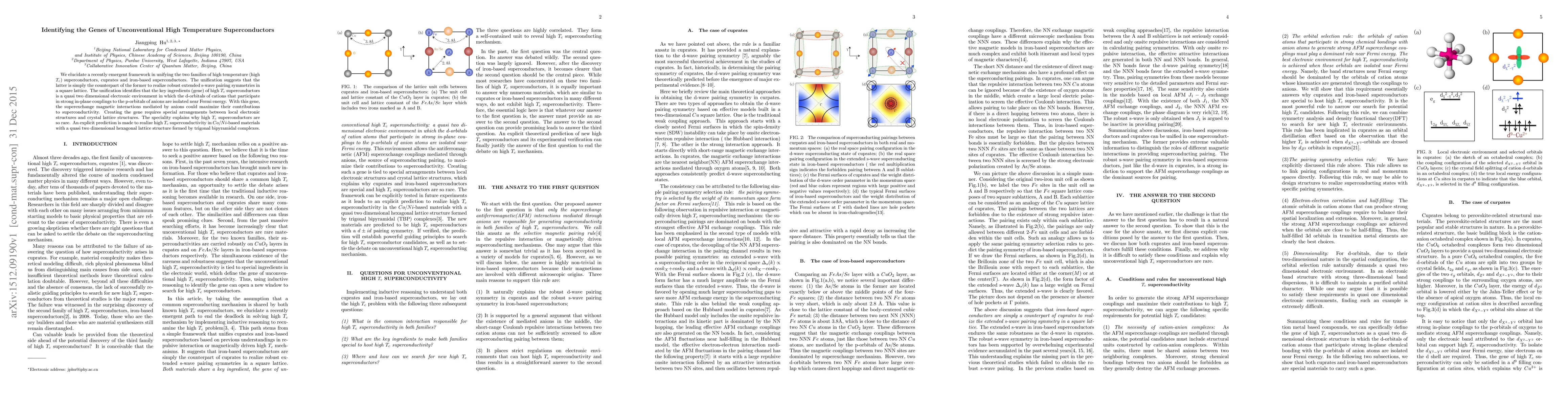 We elucidate a recently emergent framework in unifying the two families of high temperature (high $T_c$) superconductors, cuprates and iron-based superconductors. The unification suggests that the latter is simply the counterpart of the former to realize robust extended s-wave pairing symmetries in a square lattice. The unification identifies that the key ingredients (gene) of high $T_c$ superconductors is a quasi two dimensional electronic environment in which the d-orbitals of cations that participate in strong in-plane couplings to the p-orbitals of anions are isolated near Fermi energy. With this gene, the superexchange magnetic interactions mediated by anions could maximize their contributions to superconductivity. Creating the gene requires special arrangements between local electronic structures and crystal lattice structures. The speciality explains why high $T_c$ superconductors are so rare. An explicit prediction is made to realize high $T_c$ superconductivity in $Co/Ni$-based materials with a quasi two dimensional hexagonal lattice structure formed by trigonal bipyramidal complexes.
