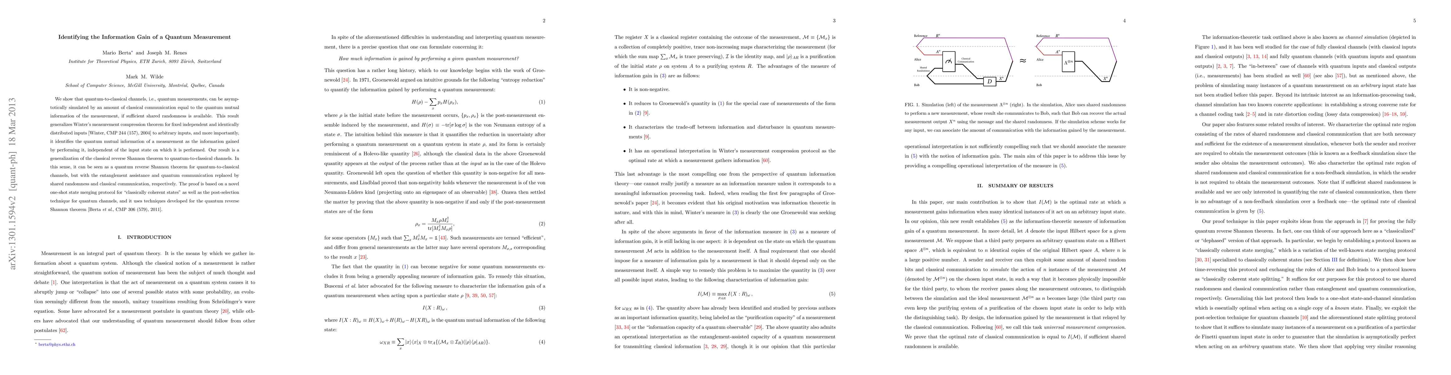 This paper demonstrates that quantum measurements can be simulated by classical communication equal to the quantum mutual information, generalizing Winter's theorem to arbitrary inputs. It identifies the quantum mutual information as the information gain from the measurement, akin to a quantum reverse Shannon theorem using shared randomness instead of entanglement.