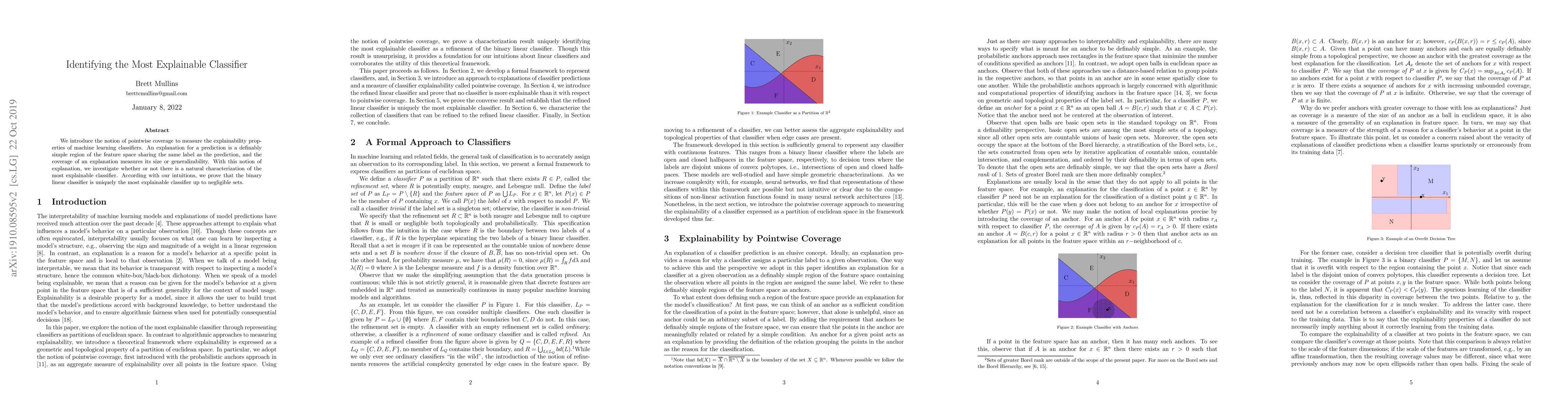We introduce the notion of pointwise coverage to measure the explainability properties of machine learning classifiers. An explanation for a prediction is a definably simple region of the feature space sharing the same label as the prediction, and the coverage of an explanation measures its size or generalizability. With this notion of explanation, we investigate whether or not there is a natural characterization of the most explainable classifier. According with our intuitions, we prove that the binary linear classifier is uniquely the most explainable classifier up to negligible sets.