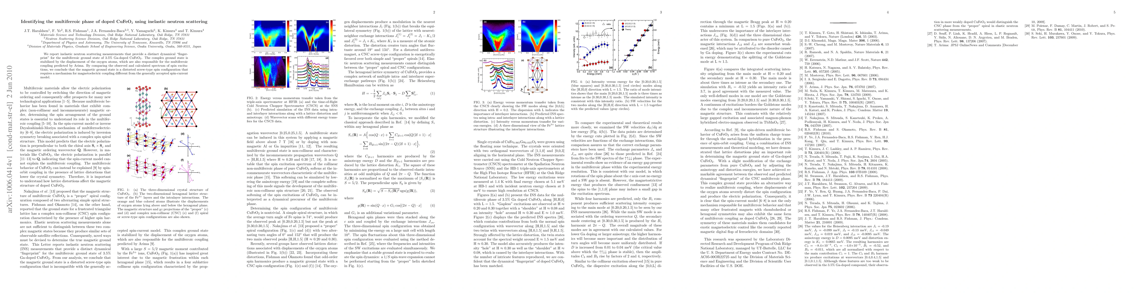 The study reveals a unique dynamical signature in Ga-doped CuFeO_2 using inelastic neutron scattering, confirming its multiferroic ground state driven by oxygen atom displacements. The magnetic ground state features a distorted screw-type spin configuration, challenging conventional spin-current based magnetoelectric coupling mechanisms.