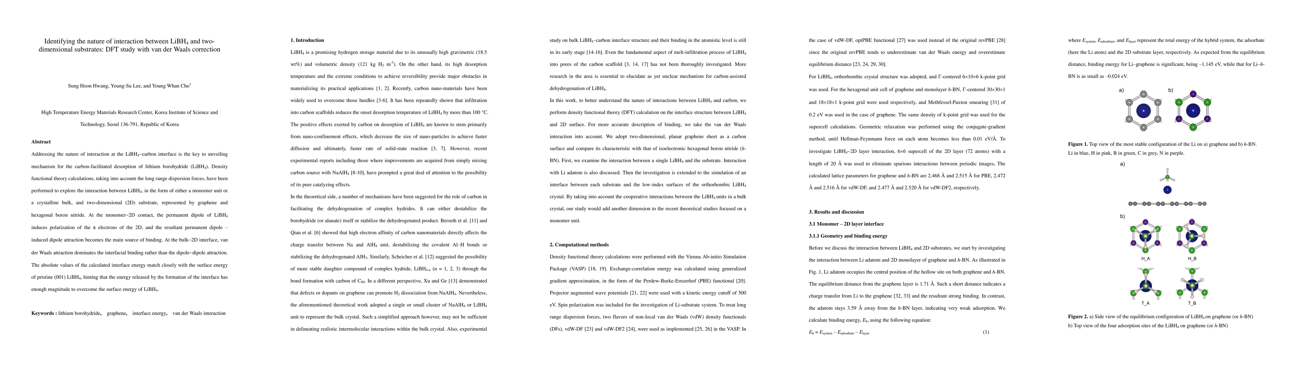 Researchers used density functional theory to study the interaction between lithium borohydride and two-dimensional substrates like graphene, finding that dipole-induced attraction plays a key role in binding at the monomer level, while van der Waals forces dominate at the bulk interface.