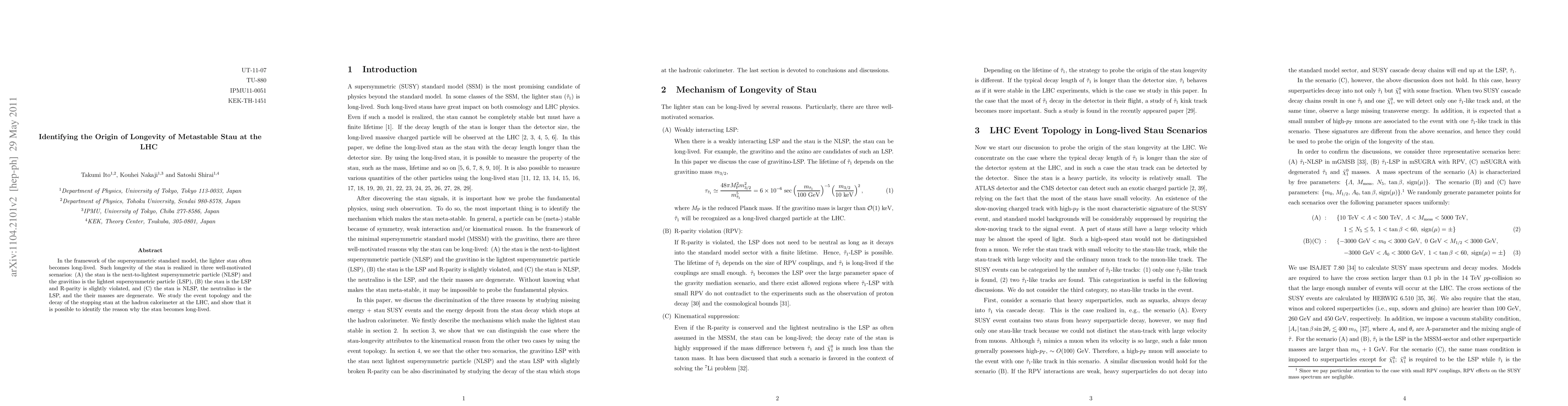 This paper explores the longevity of the metastable stau in the supersymmetric standard model, identifying three scenarios for its extended lifetime. By analyzing the event topology and decay patterns at the LHC, the study aims to determine the underlying cause for the stau's long-lived nature.