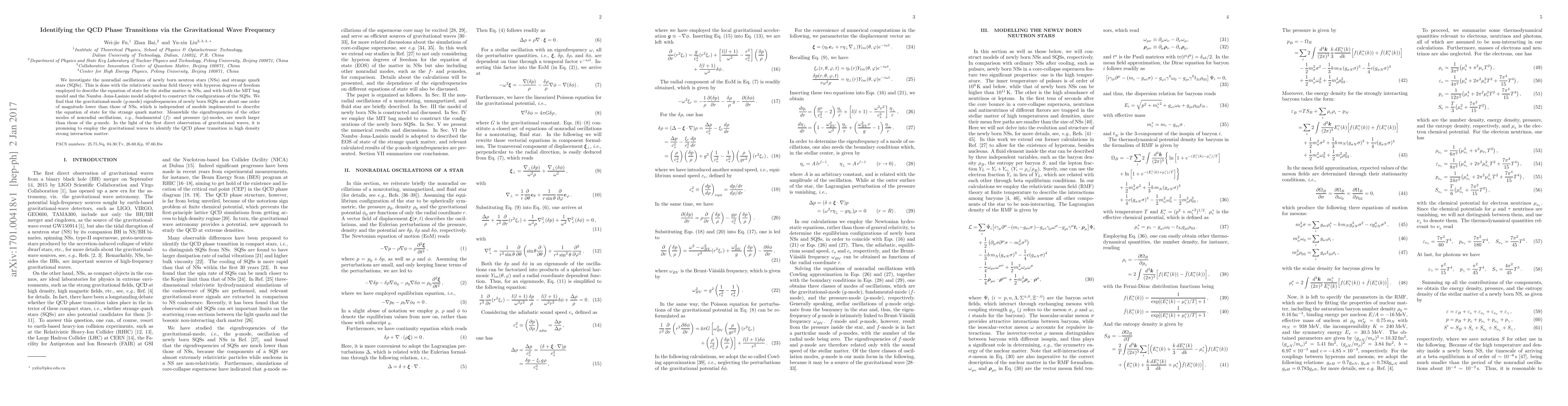 We investigate the nonradial oscillations of newly born neutron stars (NSs) and strange quark stars (SQSs). This is done with the relativistic nuclear field theory with hyperon degrees of freedom employed to describe the equation of state for the stellar matter in NSs, and with both the MIT bag model and the Nambu--Jona-Lasinio model adopted to construct the configurations of the SQSs. We find that the gravitational-mode ($g$-mode) eigenfrequencies of newly born SQSs are about one order of magnitude lower than those of NSs, which is independent of models implemented to describe the equation of state for the strange quark matter. Meanwhile the eigenfrequencies of the other modes of nonradial oscillations, e.g., fundamental ($f$)- and pressure ($p$)-modes, are much larger than those of the $g$-mode. In the light of the first direct observation of gravitational waves, it is promising to employ the gravitational waves to identify the QCD phase transition in high density strong interaction matter.