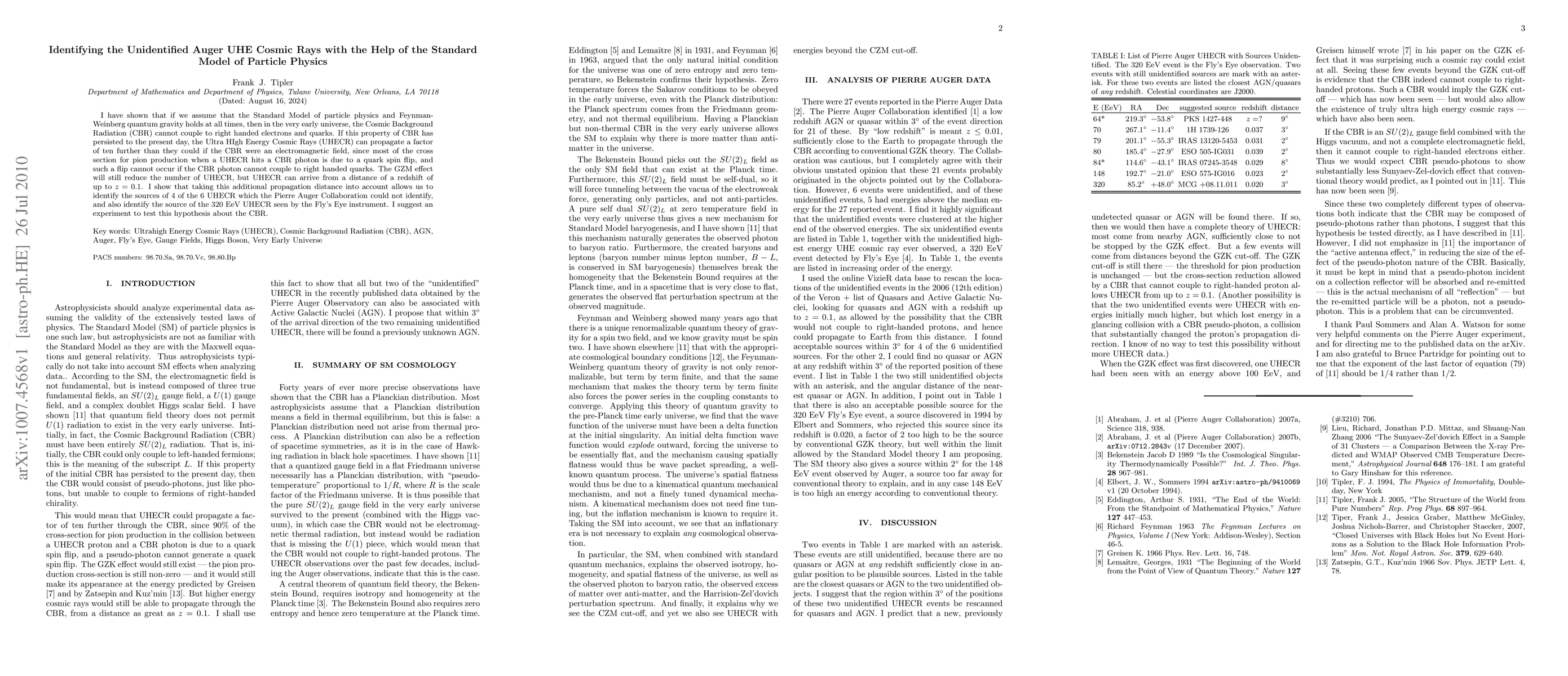 I have shown that if we assume that the Standard Model of particle physics and Feynman-Weinberg quantum gravity holds at all times, then in the very early universe, the Cosmic Background Radiation (CBR) cannot couple to right handed electrons and quarks. If this property of CBR has persisted to the present day, the Ultra HIgh Energy Cosmic Rays (UHECR) can propagate a factor of ten further than they could if the CBR were an electromagnetic field, since most of the cross section for pion production when a UHECR hits a CBR photon is due to a quark spin flip, and such a flip cannot occur if the CBR photon cannot couple to right handed quarks. The GZM effect will still reduce the number of UHECR, but UHECR can arrive from a distance of a redshift of up to $z=0.1$. I show that taking this additional propagation distance into account allows us to identify the sources of 4 of the 6 UHECR which the Pierre Auger Collaboration could not identify, and also identify the source of the 320 EeV UHECR seen by the Fly's Eye instrument. I suggest an experiment to test this hypothesis about the CBR.