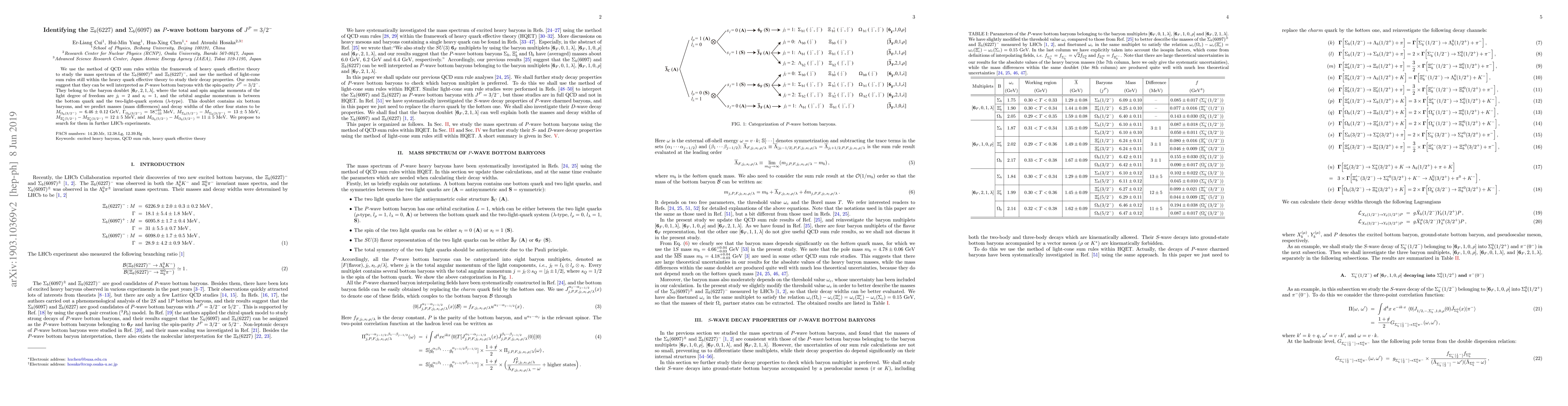 The research applies QCD and light-cone sum rules within heavy quark effective theory to confirm $Xi_b(6227)$ and $Sigma_b(6097)$ as $P$-wave bottom baryons with $J^P = 3/2^-$. It also predicts masses and decay widths for other six bottom baryons in the same doublet for future LHCb experiments.