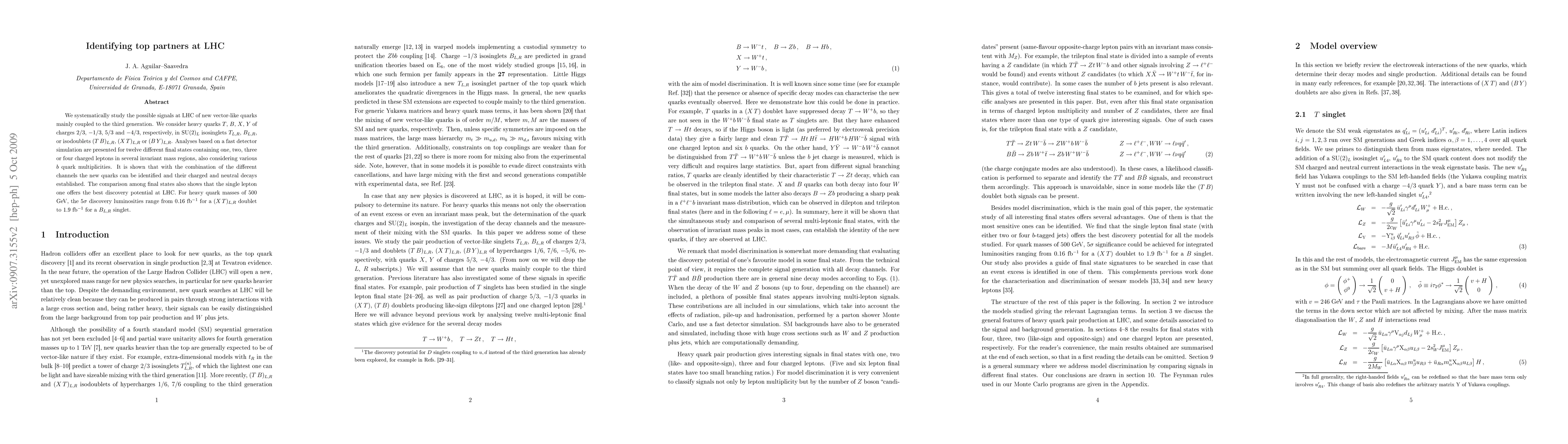 We systematically study the possible signals at LHC of new vector-like quarks mainly coupled to the third generation. We consider heavy quarks T, B, X, Y of charges 2/3, -1/3, 5/3 and -4/3, respectively, in SU(2)_L isosinglets T_{L,R}, B_{L,R}, or isodoublets (T B)_{L,R}, (X T)_{L,R} or (B Y)_{L,R}. Analyses based on a fast detector simulation are presented for twelve different final states containing one, two, three or four charged leptons in several invariant mass regions, also considering various b quark multiplicities. It is shown that with the combination of the different channels the new quarks can be identified and their charged and neutral decays established. The comparison among final states also shows that the single lepton one offers the best discovery potential at LHC. For heavy quark masses of 500 GeV, the 5 sigma discovery luminosities range from 0.16 fb^-1 for a (X T)_{L,R} doublet to 1.9 fb^-1 for a B_{L,R} singlet.