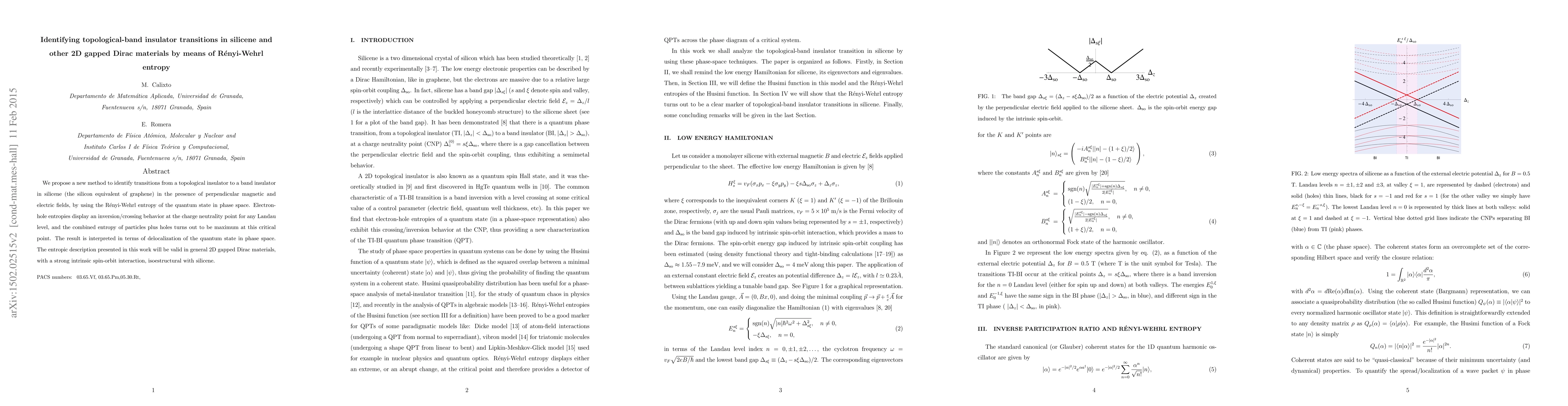 This paper proposes a novel method using R\'enyi-Wehrl entropy to identify topological-band insulator transitions in silicene and similar 2D gapped Dirac materials under magnetic and electric fields. The method reveals an entropy inversion at the charge neutrality point, indicating quantum state delocalization and applicable to other spin-orbit coupled materials.