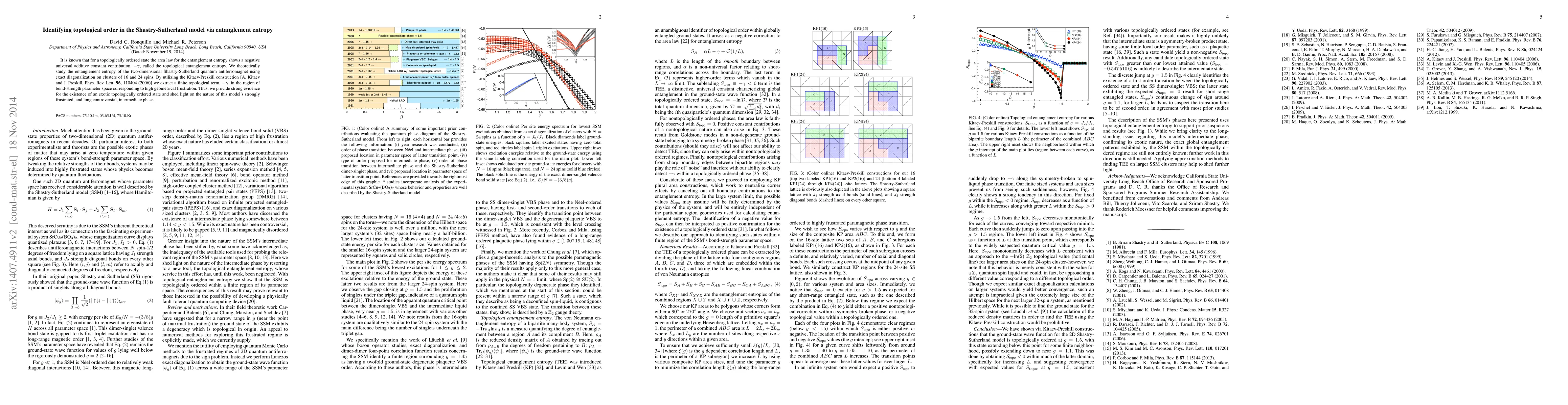 This paper investigates the entanglement entropy in the Shastry-Sutherland model to identify topological order. It finds a finite topological entanglement entropy, providing strong evidence for a topologically ordered state in the model's highly frustrated intermediate phase.