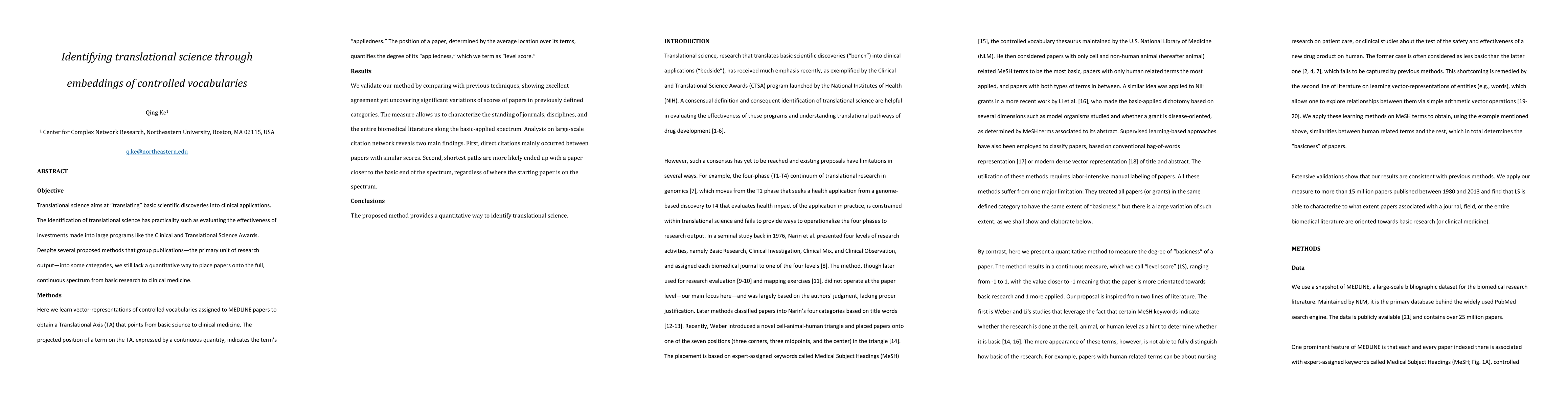 Objective: Translational science aims at "translating" basic scientific discoveries into clinical applications. The identification of translational science has practicality such as evaluating the effectiveness of investments made into large programs like the Clinical and Translational Science Awards. Despite several proposed methods that group publications---the primary unit of research output---into some categories, we still lack a quantitative way to place papers onto the full, continuous spectrum from basic research to clinical medicine. Methods: Here we learn vector-representations of controlled vocabularies assigned to MEDLINE papers to obtain a Translational Axis (TA) that points from basic science to clinical medicine. The projected position of a term on the TA, expressed by a continuous quantity, indicates the term's "appliedness." The position of a paper, determined by the average location over its terms, quantifies the degree of its "appliedness," which we term as "level score." Results: We validate our method by comparing with previous techniques, showing excellent agreement yet uncovering significant variations of scores of papers in previously defined categories. The measure allows us to characterize the standing of journals, disciplines, and the entire biomedical literature along the basic-applied spectrum. Analysis on large-scale citation network reveals two main findings. First, direct citations mainly occurred between papers with similar scores. Second, shortest paths are more likely ended up with a paper closer to the basic end of the spectrum, regardless of where the starting paper is on the spectrum. Conclusions: The proposed method provides a quantitative way to identify translational science.