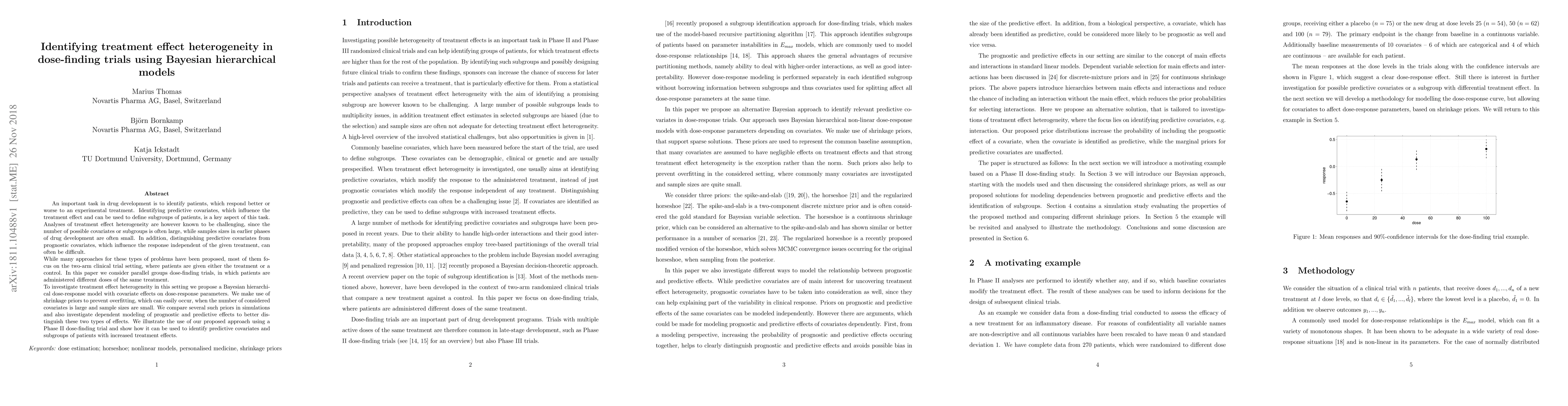An important task in drug development is to identify patients, which respond better or worse to an experimental treatment. Identifying predictive covariates, which influence the treatment effect and can be used to define subgroups of patients, is a key aspect of this task. Analyses of treatment effect heterogeneity are however known to be challenging, since the number of possible covariates or subgroups is often large, while samples sizes in earlier phases of drug development are often small. In addition, distinguishing predictive covariates from prognostic covariates, which influence the response independent of the given treatment, can often be difficult. While many approaches for these types of problems have been proposed, most of them focus on the two-arm clinical trial setting, where patients are given either the treatment or a control. In this paper we consider parallel groups dose-finding trials, in which patients are administered different doses of the same treatment. To investigate treatment effect heterogeneity in this setting we propose a Bayesian hierarchical dose-response model with covariate effects on dose-response parameters. We make use of shrinkage priors to prevent overfitting, which can easily occur, when the number of considered covariates is large and sample sizes are small. We compare several such priors in simulations and also investigate dependent modeling of prognostic and predictive effects to better distinguish these two types of effects. We illustrate the use of our proposed approach using a Phase II dose-finding trial and show how it can be used to identify predictive covariates and subgroups of patients with increased treatment effects.