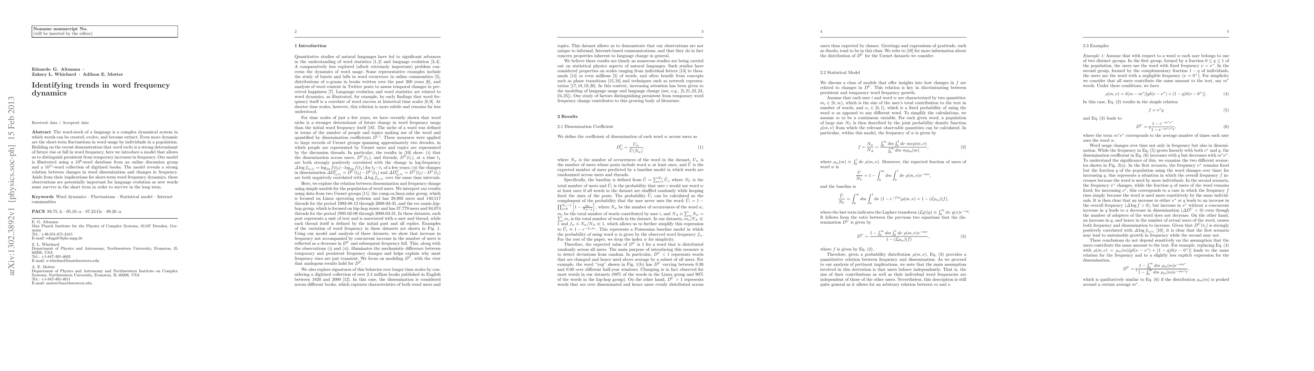 The word-stock of a language is a complex dynamical system in which words can be created, evolve, and become extinct. Even more dynamic are the short-term fluctuations in word usage by individuals in a population. Building on the recent demonstration that word niche is a strong determinant of future rise or fall in word frequency, here we introduce a model that allows us to distinguish persistent from temporary increases in frequency. Our model is illustrated using a 10^8-word database from an online discussion group and a 10^11-word collection of digitized books. The model reveals a strong relation between changes in word dissemination and changes in frequency. Aside from their implications for short-term word frequency dynamics, these observations are potentially important for language evolution as new words must survive in the short term in order to survive in the long term.