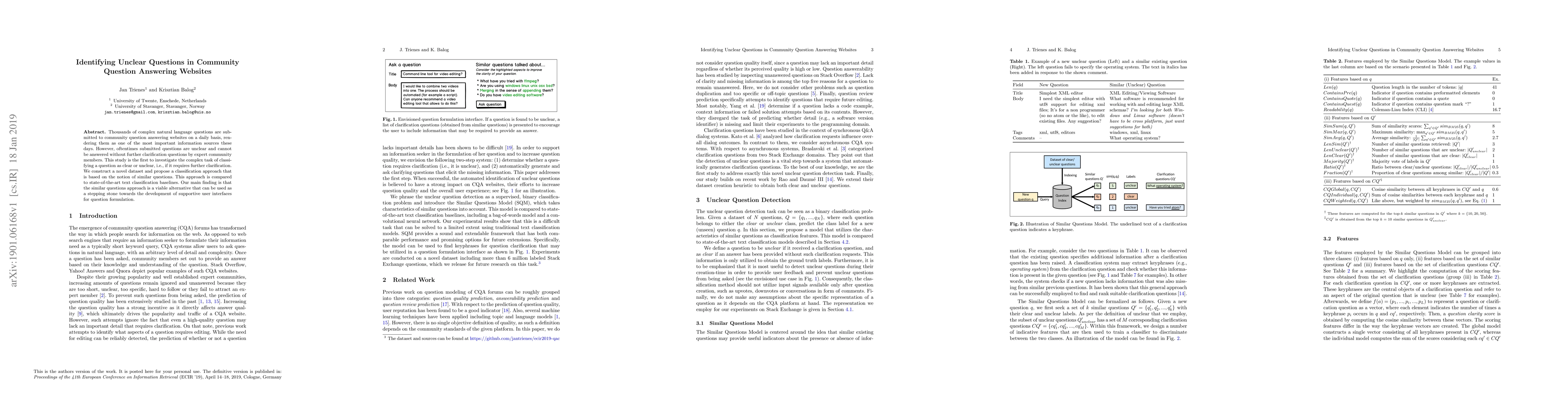 This study introduces a novel dataset to classify unclear questions on community question answering websites, proposing a classification approach based on similar questions. The results suggest that this method can be an effective alternative to existing text classification techniques, potentially aiding in the development of supportive user interfaces for question formulation.
