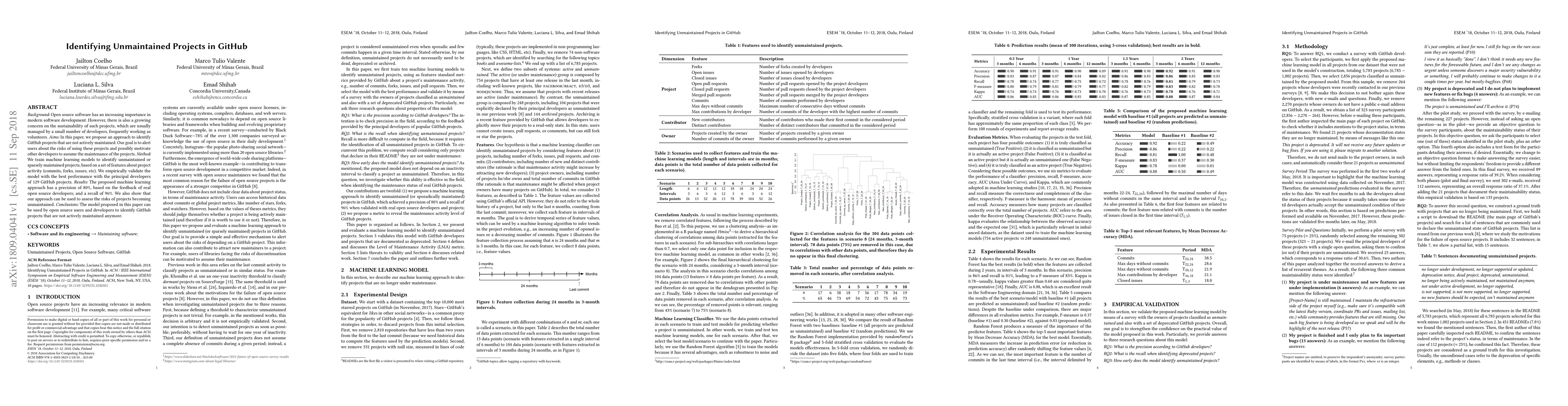 This paper proposes a machine learning model to identify unmaintained GitHub projects based on activity features like commits and issues, achieving 80% precision and 96% recall according to principal developers' feedback. The model aims to alert users and motivate new developers to take over maintenance.