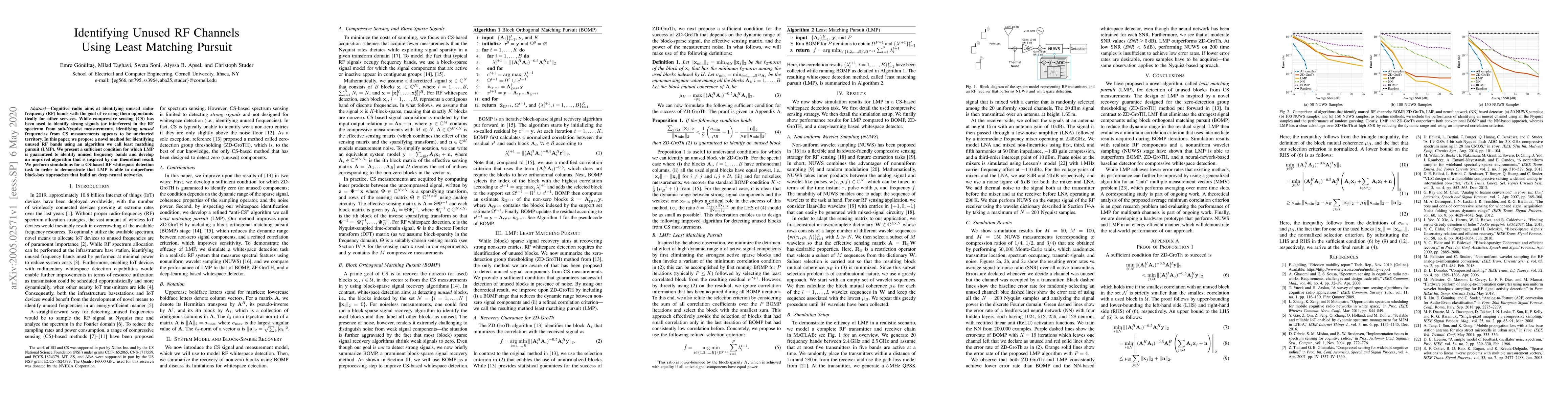 A new method called least matching pursuit (LMP) is proposed to identify unused RF bands in the spectrum, outperforming traditional approaches that rely on deep neural networks. LMP is able to identify unused frequencies with a guaranteed sufficient condition.