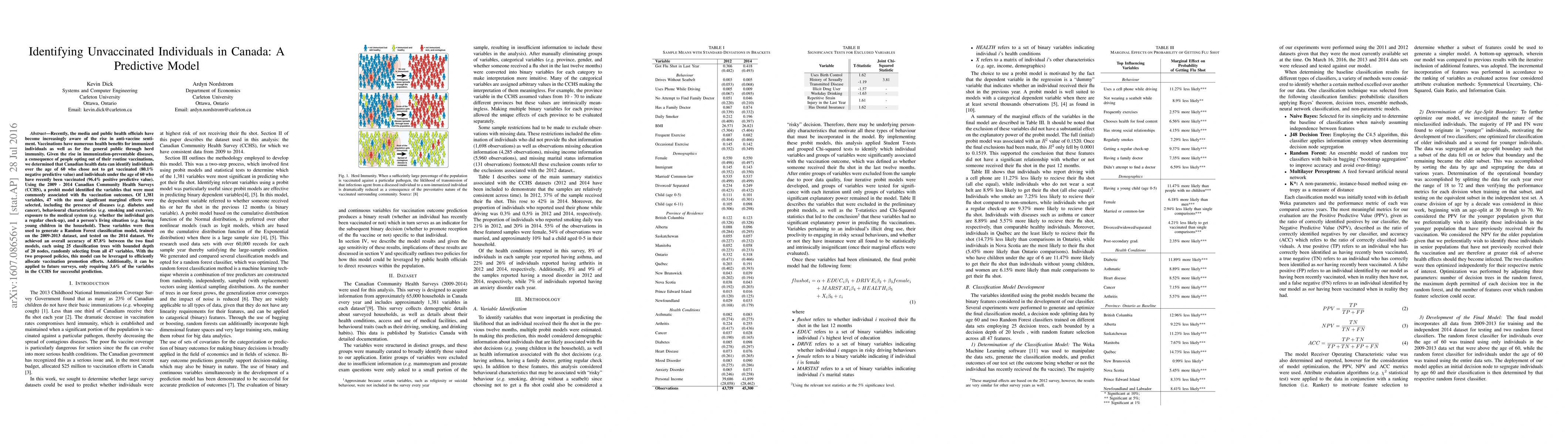A predictive model identified Canadian health data to predict unvaccinated individuals over 60 (80.1% negative predictive value) and those under 60 who have recently been vaccinated (96.4% positive predictive value), using variables such as diseases, behavior, medical exposure, and living situation.
