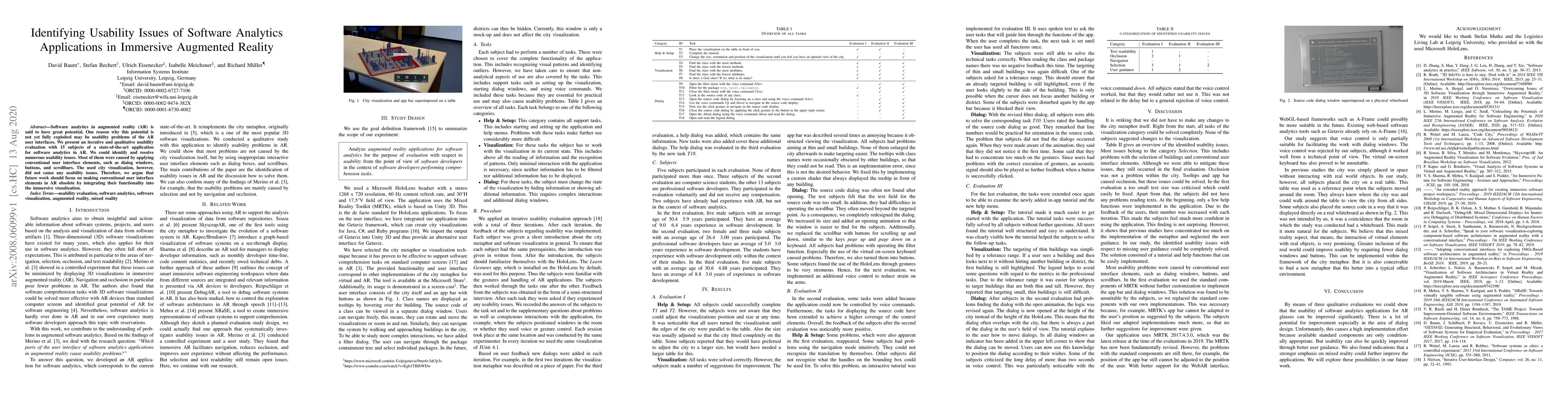 This paper identifies usability issues in software analytics applications for augmented reality (AR) through an iterative qualitative usability evaluation. The study found that conventional user interface elements often caused usability problems, while immersive city visualizations did not, suggesting a need to integrate conventional UI elements' functionality into the AR visualization.