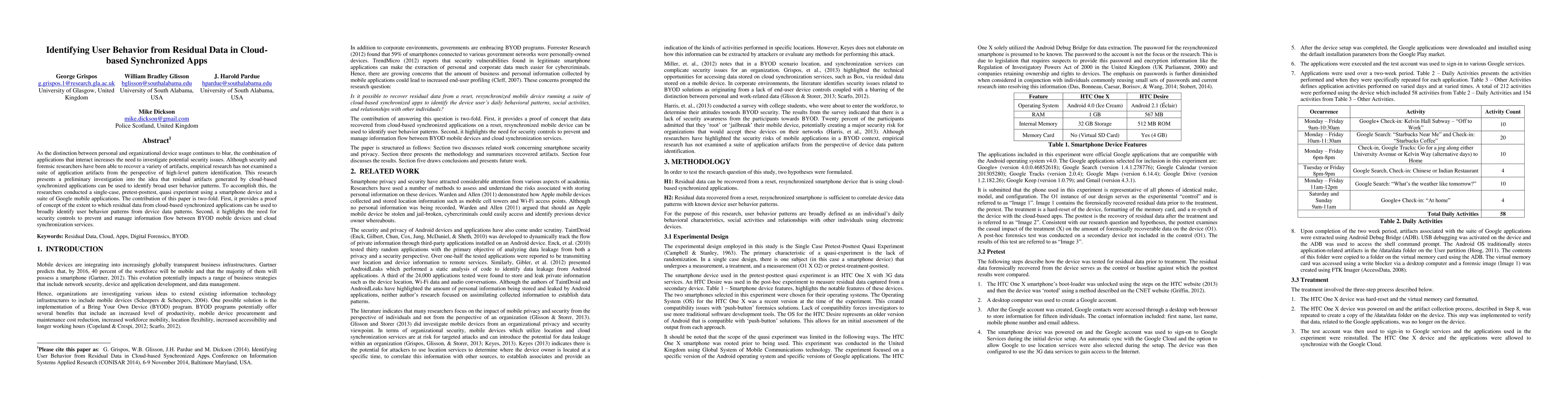 As the distinction between personal and organizational device usage continues to blur, the combination of applications that interact increases the need to investigate potential security issues. Although security and forensic researchers have been able to recover a variety of artifacts, empirical research has not examined a suite of application artifacts from the perspective of high-level pattern identification. This research presents a preliminary investigation into the idea that residual artifacts generated by cloud-based synchronized applications can be used to identify broad user behavior patterns. To accomplish this, the researchers conducted a single-case, pretest-posttest, quasi experiment using a smartphone device and a suite of Google mobile applications. The contribution of this paper is two-fold. First, it provides a proof of concept of the extent to which residual data from cloud-based synchronized applications can be used to broadly identify user behavior patterns from device data patterns. Second, it highlights the need for security controls to prevent and manage information flow between BYOD mobile devices and cloud synchronization services. Keywords: Residual Data, Cloud, Apps, Digital Forensics, BYOD