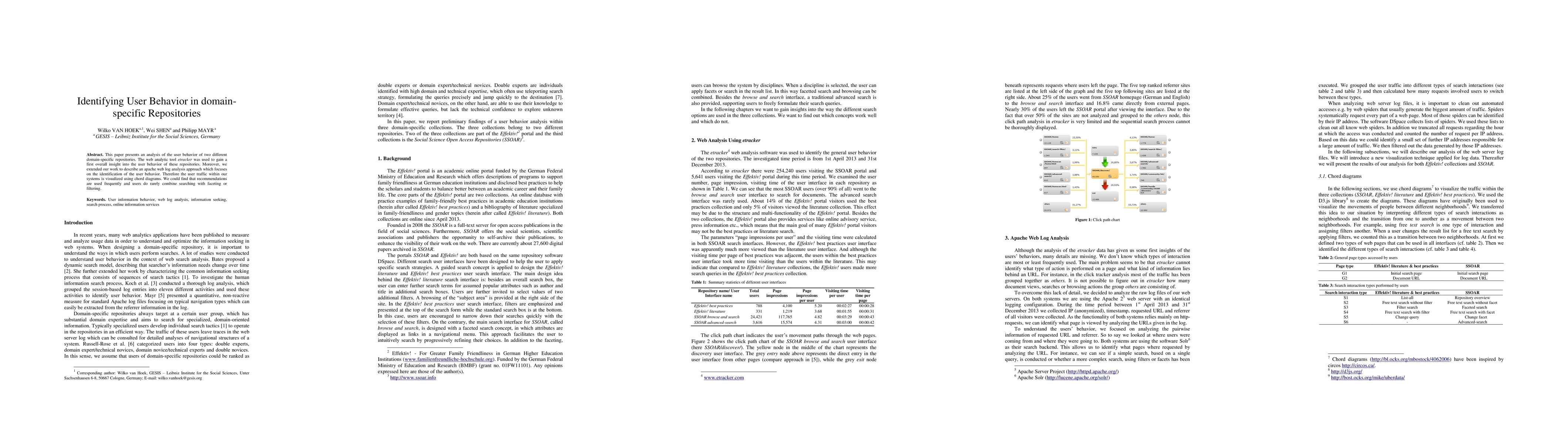 This paper analyzes user behavior in two domain-specific repositories using etracker and apache web log analysis. Key findings indicate frequent use of recommendations and rare combination of searching with faceting or filtering, visualized via chord diagrams.