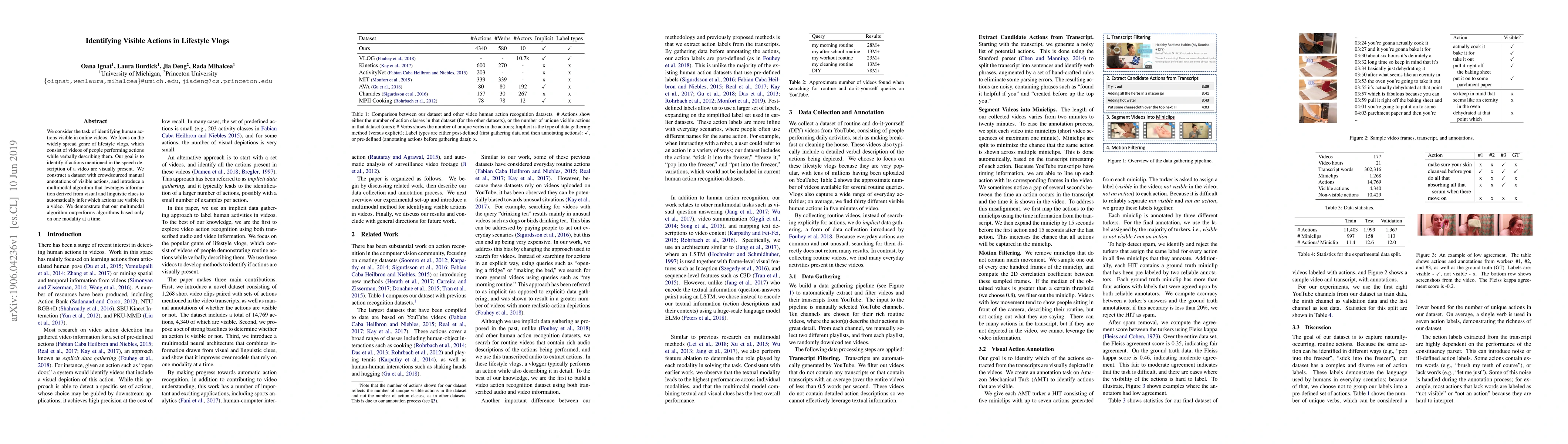 We consider the task of identifying human actions visible in online videos. We focus on the widely spread genre of lifestyle vlogs, which consist of videos of people performing actions while verbally describing them. Our goal is to identify if actions mentioned in the speech description of a video are visually present. We construct a dataset with crowdsourced manual annotations of visible actions, and introduce a multimodal algorithm that leverages information derived from visual and linguistic clues to automatically infer which actions are visible in a video. We demonstrate that our multimodal algorithm outperforms algorithms based only on one modality at a time.