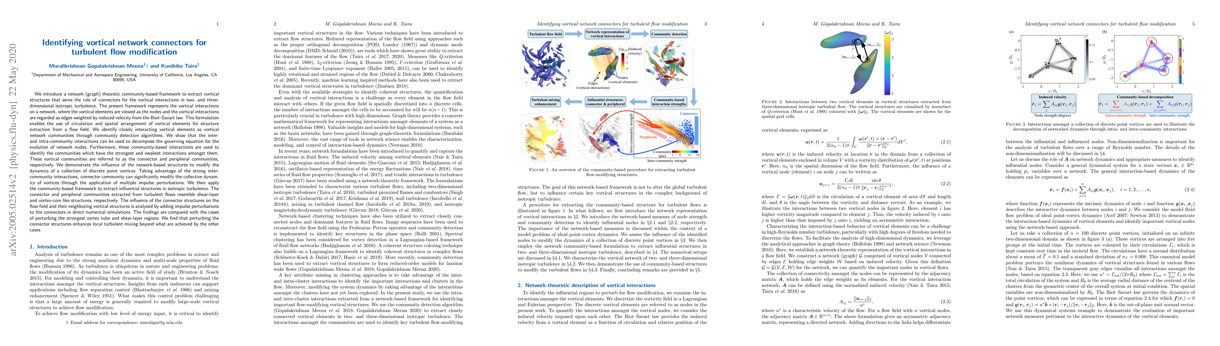 We introduce a network (graph) theoretic community-based framework to extract vortical structures that serve the role of connectors for the vortical interactions in two- and three-dimensional isotropic turbulence. The present framework represents the vortical interactions on a network, where the vortical elements are viewed as the nodes and the vortical interactions are regarded as edges weighted by induced velocity. We identify closely interacting vortical elements as vortical network communities through community detection algorithms. We show that the inter- and intra-community interactions can be used to decompose the governing equation for the evolution of network nodes. These community-based interactions are used to identify the communities which have the strongest and weakest interactions amongst them. These vortical communities are referred to as connector and peripheral communities, respectively. We demonstrate the influence of the network-based structures to modify the dynamics of a collection of discrete point vortices. Taking advantage of the strong inter-community interactions, connector community can significantly modify the collective dynamics of vortices through the application of multiple impulse perturbations. We then apply the community-based framework to extract influential structures in isotropic turbulence. The connector and peripheral communities extracted from turbulent flows resemble shear-layer and vortex-core like structures, respectively. The influence of the connector structures on the flow field and their neighboring vortical structures is analyzed by adding impulse perturbations to the connectors in direct numerical simulations. The findings are compared with the cases of perturbing the strongest vortex tube and shear-layer regions. We find that perturbing the connector structures enhances local turbulent mixing beyond what are achieved by the other cases.