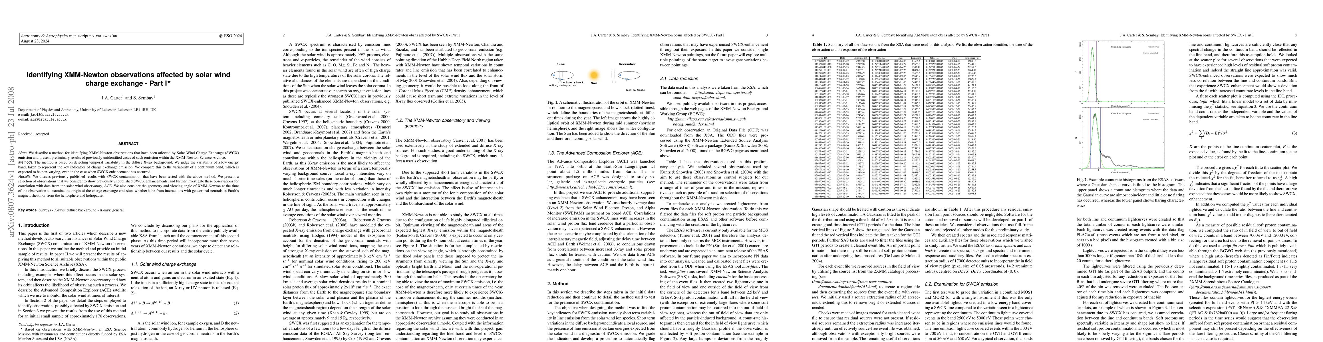 We describe a method for identifying XMM-Newton observations that have been affected by Solar Wind Charge Exchange (SWCX) emission and present preliminary results of previously unidentified cases of such emission within the XMM-Newton Science Archive. The method is based on detecting temporal variability in the diffuse X-ray background. We judge the variability of a low energy band, taken to represent the key indicators of charge exchange emission. We compare this to the variability of a continuum band, which is expected to be non-varying, even in the case when SWCX enhancement has occurred. We discuss previously published results with SWCX contamination that have been tested with the above method. We present a selection of observations that we consider to show previously unpublished SWCX enhancements, and further investigate these observations for correlation with data from the solar wind observatory, ACE. We also consider the geometry and viewing angle of XMM-Newton at the time of the observation to examine the origin of the charge exchange emission, whether it be from interactions with geocoronal neutrals in Earth's magnetosheath or from the heliosphere and heliopause.
