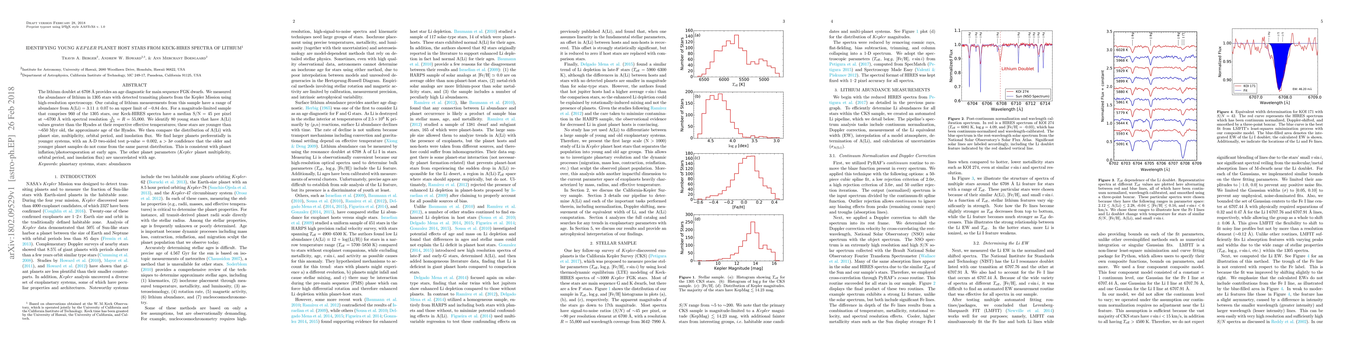 This study uses high-resolution spectroscopy to measure lithium abundance in 1305 Kepler planet host stars, identifying 80 young stars younger than 650 Myr. Larger planets are found preferentially in younger systems, suggesting planet inflation/photoevaporation in early stellar ages, while other planet parameters show no correlation with age.