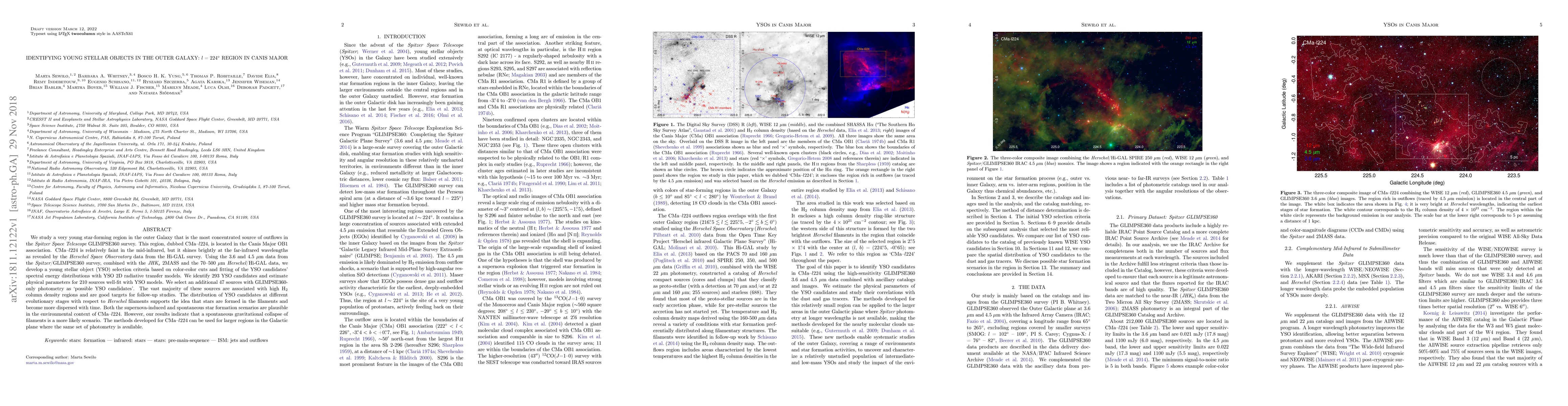 We study a very young star-forming region in the outer Galaxy that is the most concentrated source of outflows in the Spitzer Space Telescope GLIMPSE360 survey. This region, dubbed CMa-l224, is located in the Canis Major OB1 association. CMa-l224 is relatively faint in the mid-infrared, but it shines brightly at the far-infrared wavelengths as revealed by the Herschel Space Observatory data from the Hi-GAL survey. Using the 3.6 and 4.5 $\mu$m data from the Spitzer/GLIMPSE360 survey, combined with the JHK$_s$ 2MASS and the 70-500 $\mu$m Herschel/Hi-GAL data, we develop a young stellar object (YSO) selection criteria based on color-color cuts and fitting of the YSO candidates' spectral energy distributions with YSO 2D radiative transfer models. We identify 293 YSO candidates and estimate physical parameters for 210 sources well-fit with YSO models. We select an additional 47 sources with GLIMPSE360-only photometry as `possible YSO candidates'. The vast majority of these sources are associated with high H$_2$ column density regions and are good targets for follow-up studies. The distribution of YSO candidates at different evolutionary stages with respect to Herschel filaments supports the idea that stars are formed in the filaments and become more dispersed with time. Both the supernova-induced and spontaneous star formation scenarios are plausible in the environmental context of CMa-l224. However, our results indicate that a spontaneous gravitational collapse of filaments is a more likely scenario. The methods developed for CMa-l224 can be used for larger regions in the Galactic plane where the same set of photometry is available.