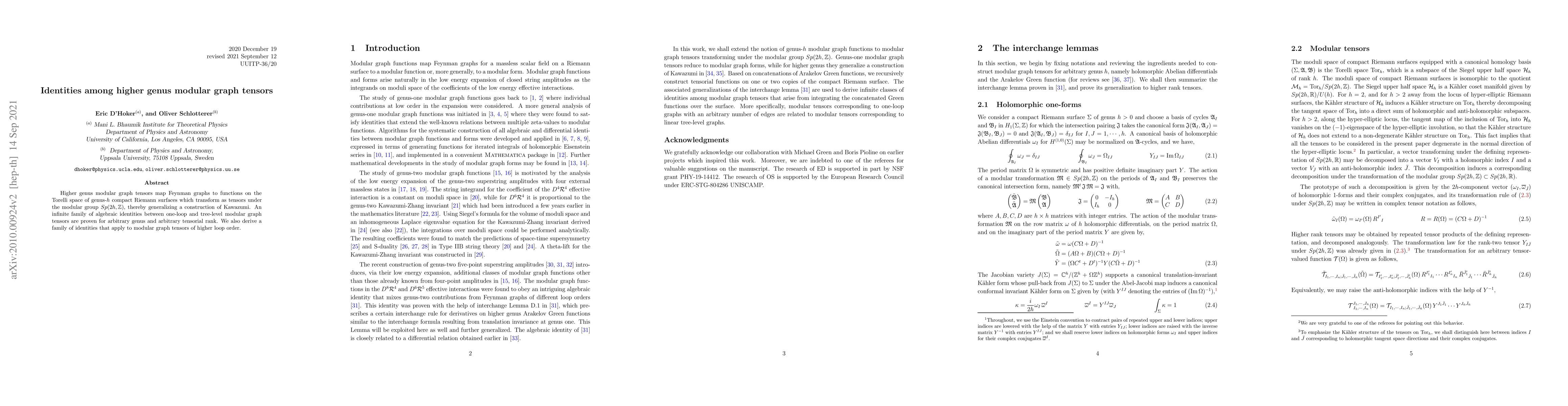 Higher genus modular graph tensors map Feynman graphs to functions on the Torelli space of genus-$h$ compact Riemann surfaces which transform as tensors under the modular group $Sp(2h , \mathbb Z)$, thereby generalizing a construction of Kawazumi. An infinite family of algebraic identities between one-loop and tree-level modular graph tensors are proven for arbitrary genus and arbitrary tensorial rank. We also derive a family of identities that apply to modular graph tensors of higher loop order.