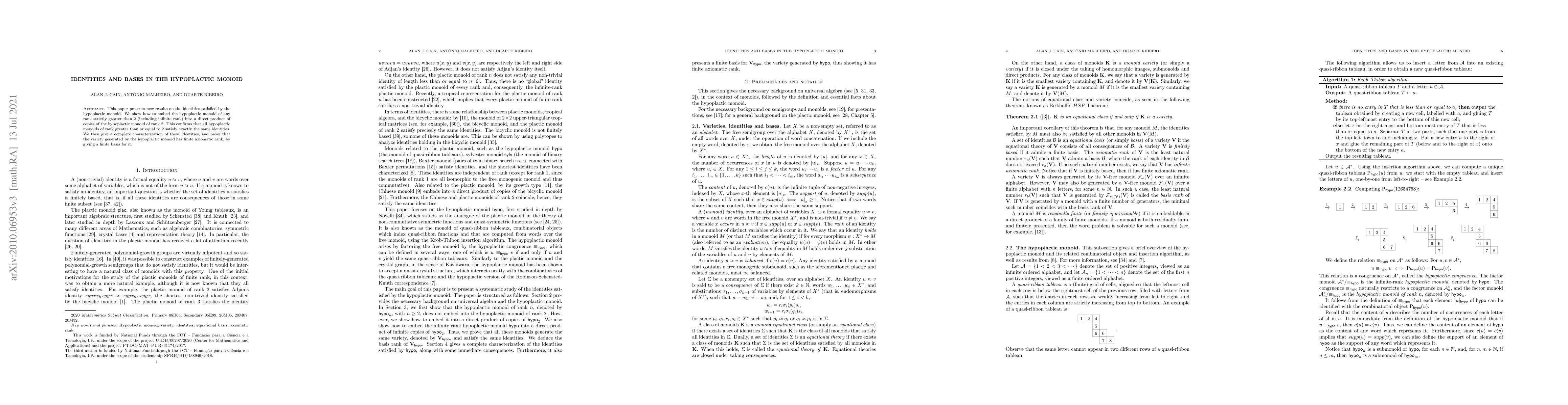 This paper presents new results on the identities satisfied by the hypoplactic monoid. We show how to embed the hypoplactic monoid of any rank strictly greater than 2 (including infinite rank) into a direct product of copies of the hypoplactic monoid of rank 2. This confirms that all hypoplactic monoids of rank greater than or equal to 2 satisfy exactly the same identities. We then give a complete characterization of those identities, and prove that the variety generated by the hypoplactic monoid has finite axiomatic rank, by giving a finite basis for it.