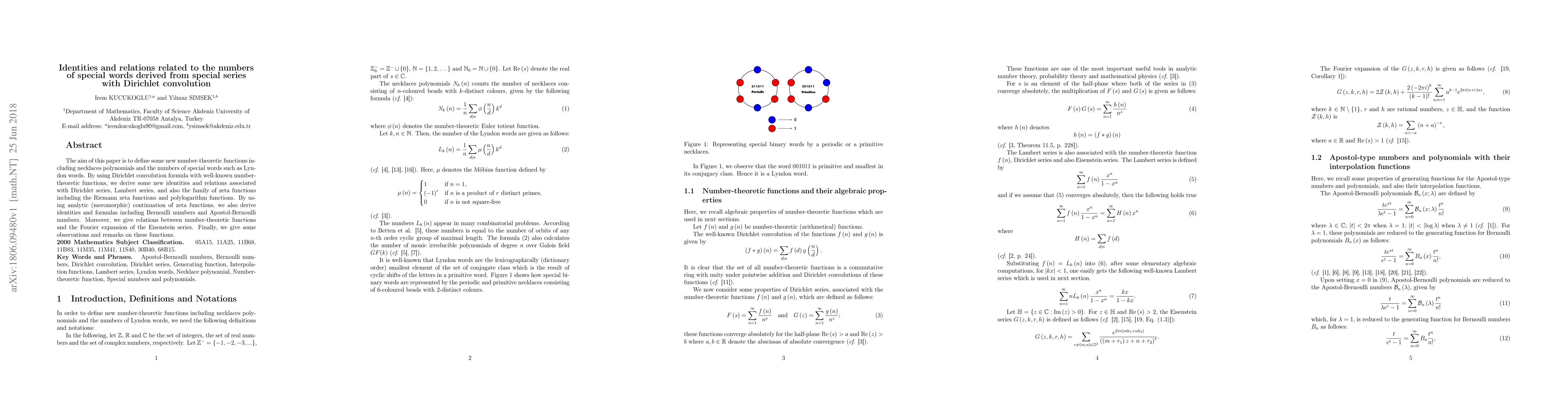 This paper introduces new number-theoretic functions like necklaces polynomials and counts special words such as Lyndon words. It derives new identities and relations using Dirichlet convolution, including connections to Dirichlet, Lambert series, and zeta functions, and extends these to include Bernoulli and Apostol-Bernoulli numbers.