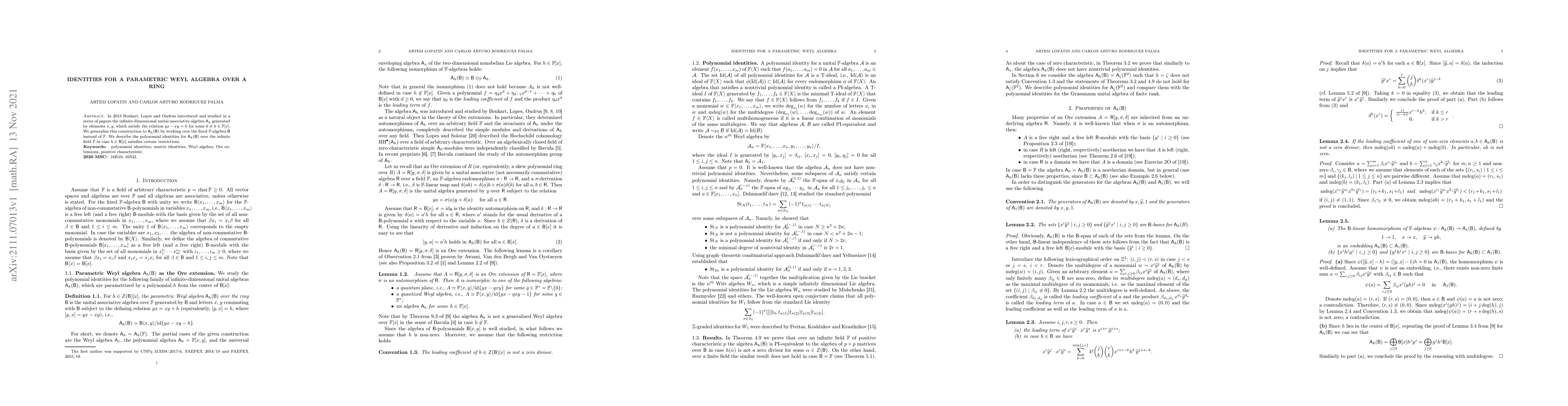 In 2013 Benkart, Lopes and Ondrus introduced and studied in a series of papers the infinite-dimensional unital associative algebra $\A_h$ generated by elements $x,y,$ which satisfy the relation $yx-xy=h$ for some $0\neq h\in \FF[x]$. We generalize this construction to $\A_h(\B)$ by working over the fixed $\FF$-algebra $\B$ instead of $\FF$. We describe the polynomial identities for $\A_h(\B)$ over the infinite field $\FF$ in case $h\in\B[x]$ satisfies certain restrictions.