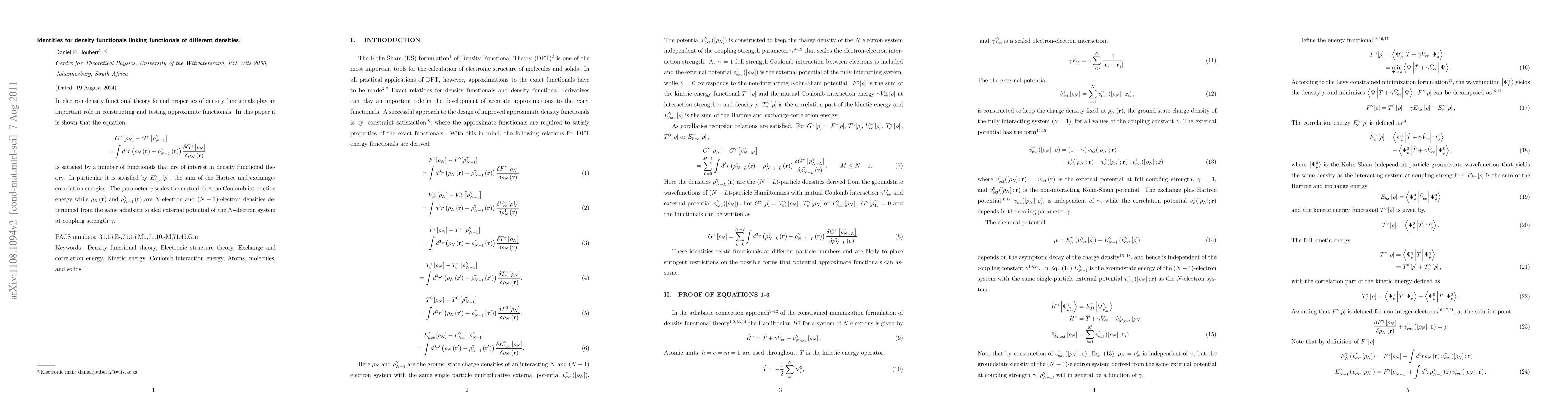 This paper demonstrates an equation linking density functionals of N and N-1 electron systems governed by the same Hamiltonian, highlighting that the identity is satisfied by the sum of Hartree and exchange-correlation energies. This provides a formal property useful for constructing and testing approximate functionals in electron density functional theory.