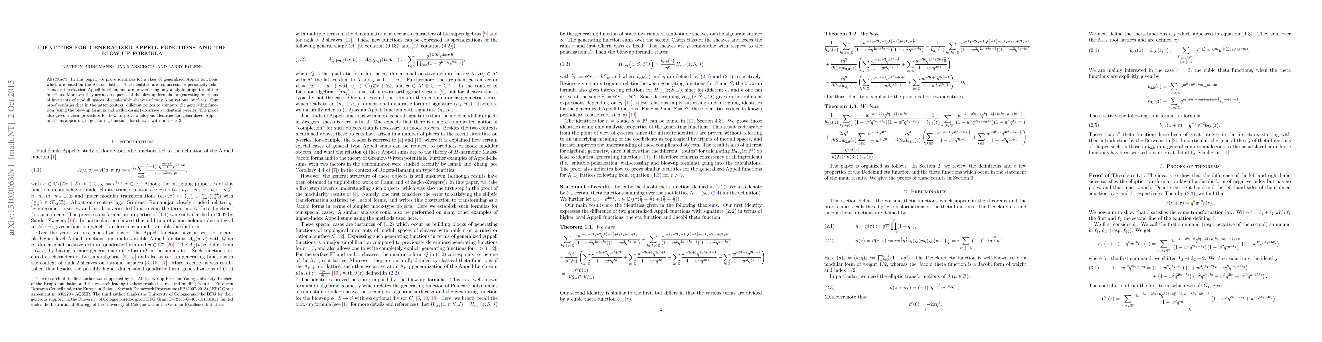In this paper, we prove identities for a class of generalized Appell functions which are based on the $\operatorname{A}_2$ root lattice. The identities are reminiscent of periodicity relations for the classical Appell function, and are proven using only analytic properties of the functions. Moreover they are a consequence of the blow-up formula for generating functions of invariants of moduli spaces of semi-stable sheaves of rank 3 on rational surfaces. Our proof confirms that in the latter context, different routes to compute the generating function (using the blow-up formula and wall-crossing) do arrive at identical $q$-series. The proof also gives a clear procedure for how to prove analogous identities for generalized Appell functions appearing in generating functions for sheaves with rank $r>3$.