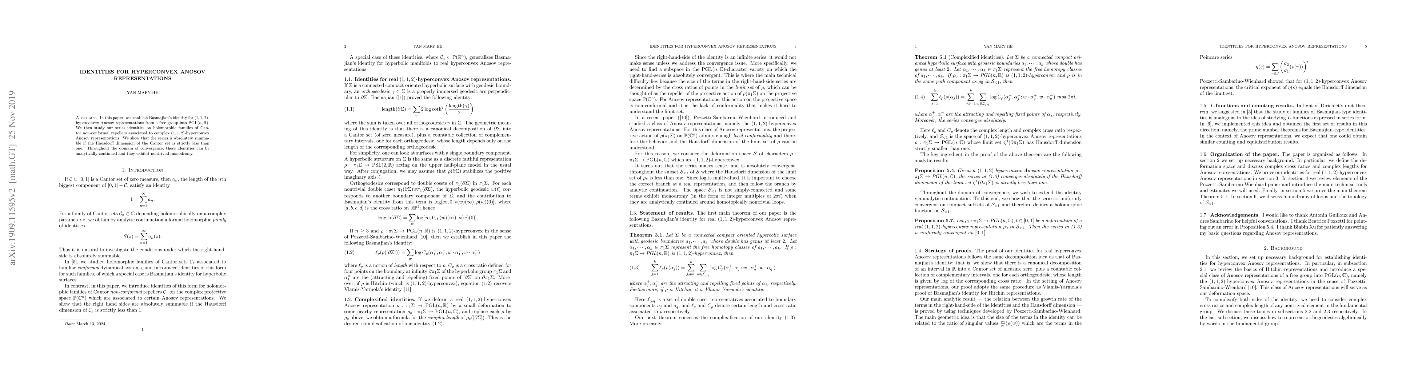 In this paper, we establish Basmajian's identity for $(1,1,2)$-hyperconvex Anosov representations from a free group into $PGL(n, R)$. We then study our series identities on holomorphic families of Cantor non-conformal repellers associated to complex $(1,1,2)$-hyperconvex Anosov representations. We show that the series is absolutely summable if and only if the Hausdorff dimension of the Cantor set is strictly less than one. Throughout the domain of convergence, these identities can be analytically continued and they exhibit nontrivial monodromy.