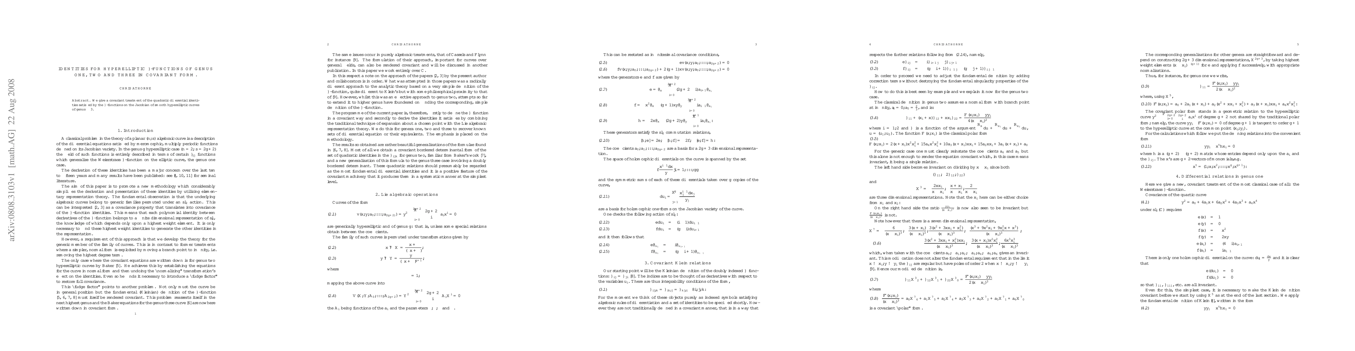 We give a covariant treatment of the quadratic differential identities satisfied by the P-functions on the Jacobian of smooth hyperelliptic curves of genera 1, 2 and 3.